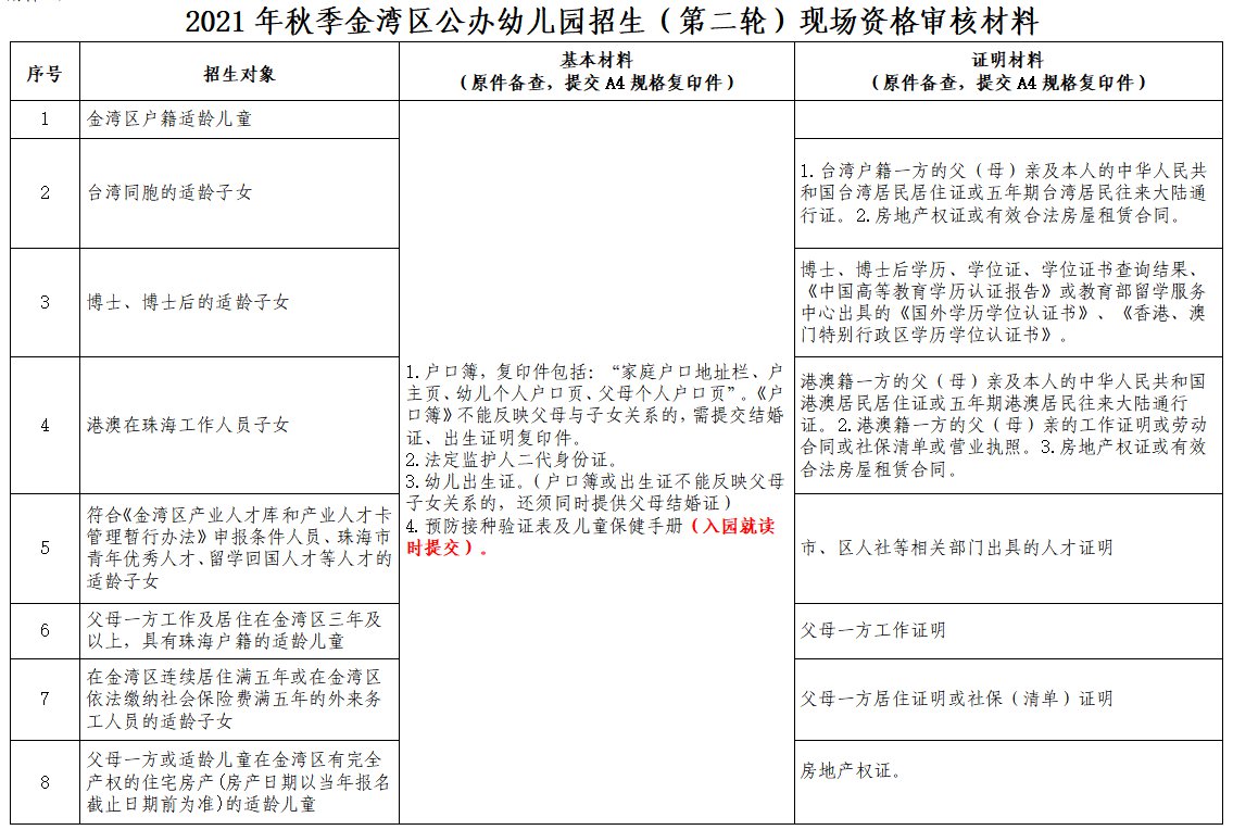 2021金湾区公办幼儿园第二轮拟录取资格审核时间+地点+材料