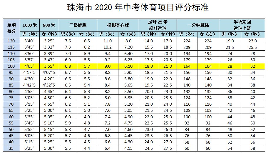 2020珠海中考体育评分标准(珠海中考体育项目及评分标准)