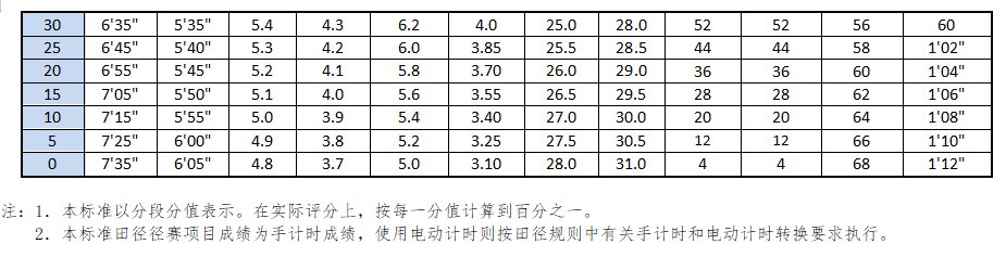 2020年初中毕业生升学体育考试框架、总分及统一测试分值保持不变,降低考试项目评分标准;其中,100米游泳不限时间,其他项目评分标准具体见下表。