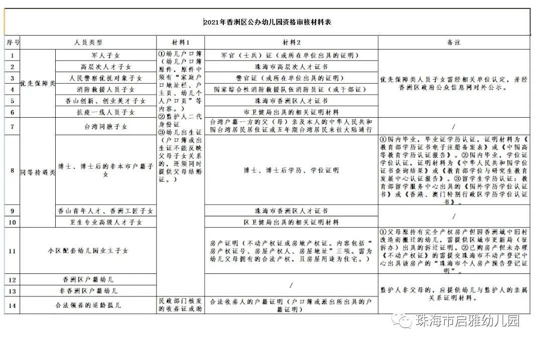 珠海香洲区启雅幼儿园2021资格审核指引