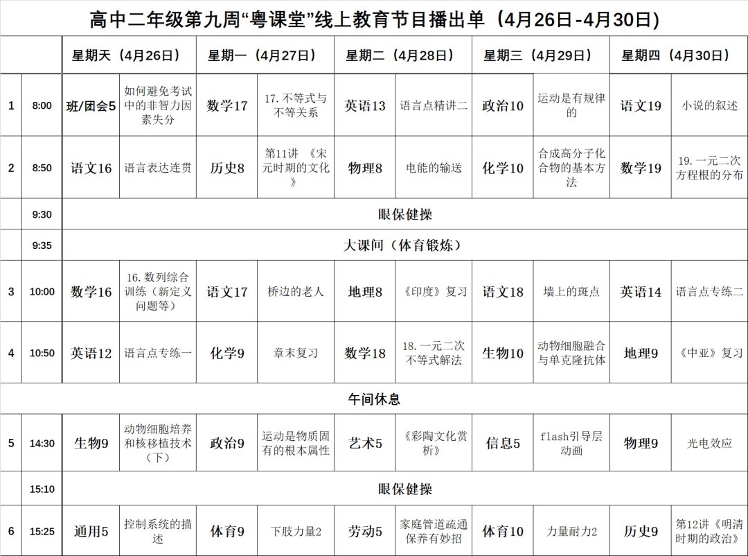 高中二年级第九周“粤课堂”线上教育节目播出单(4月26日-4月30日)