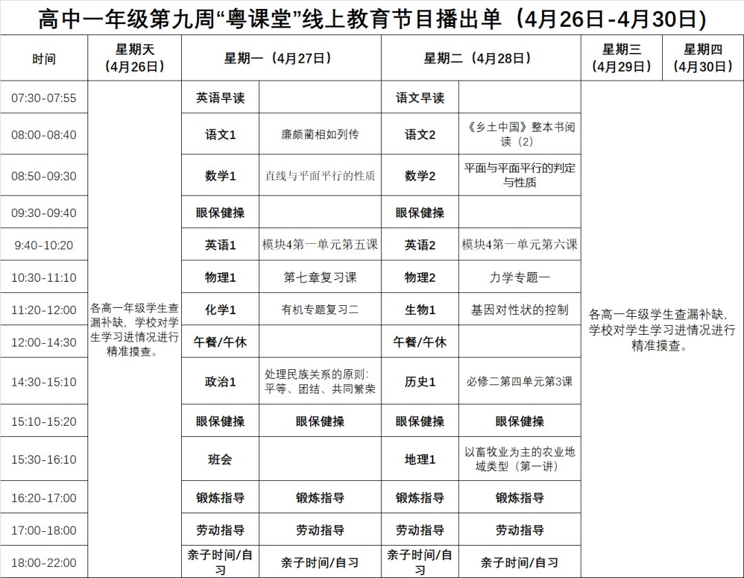 高中一年级第九周“粤课堂”线上教育节目播出单(4月26日-4月30日)