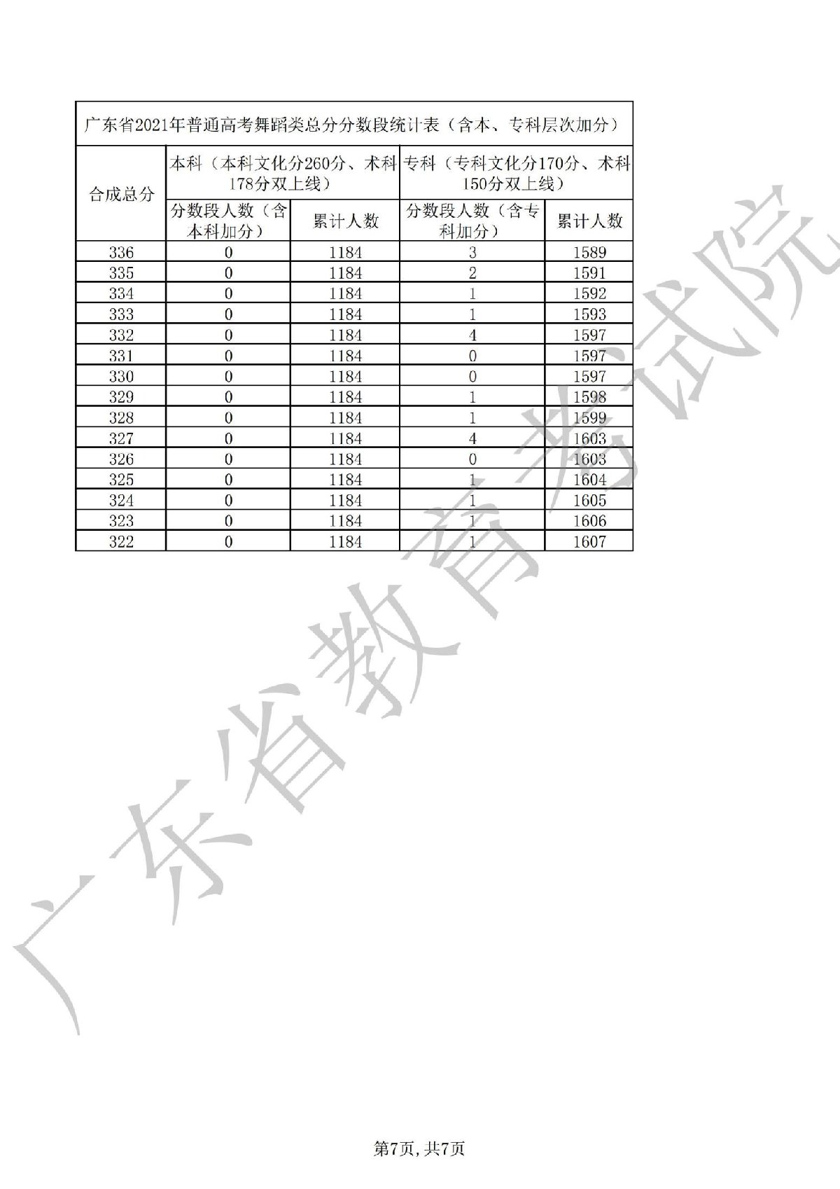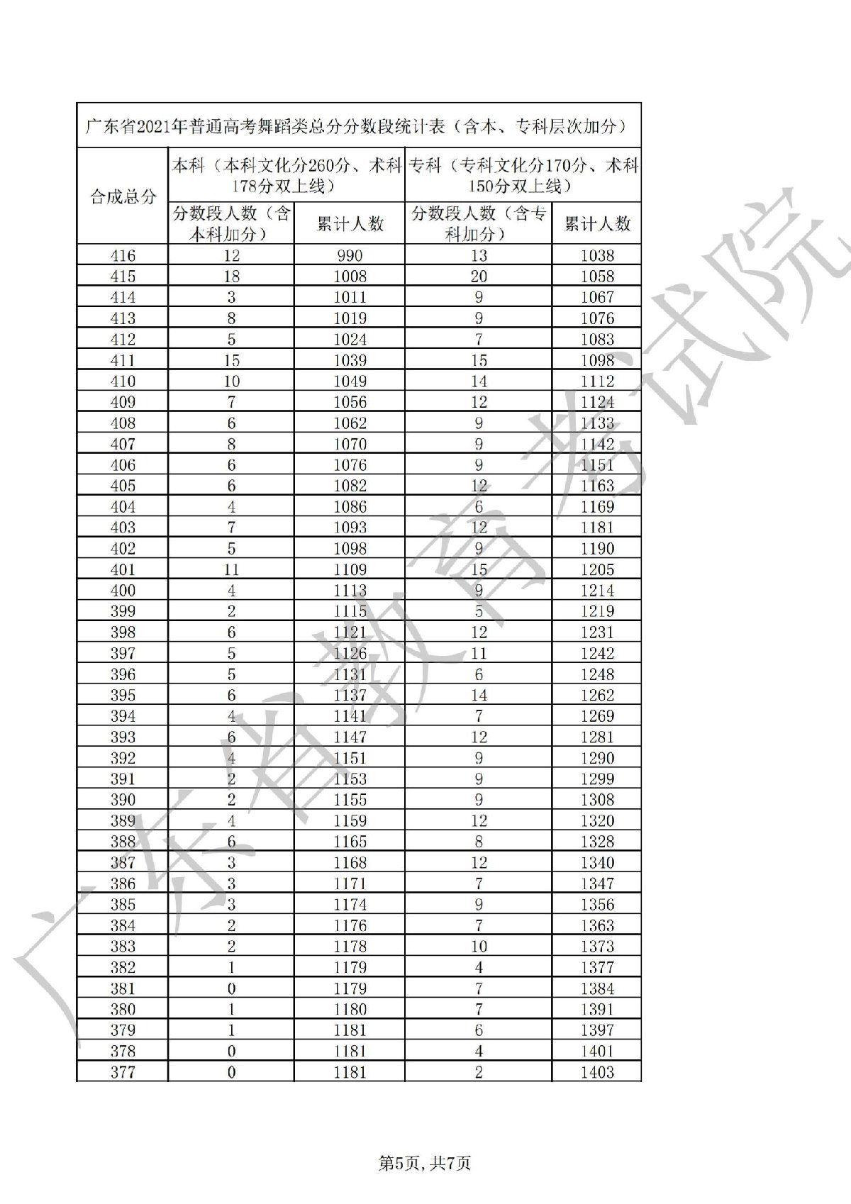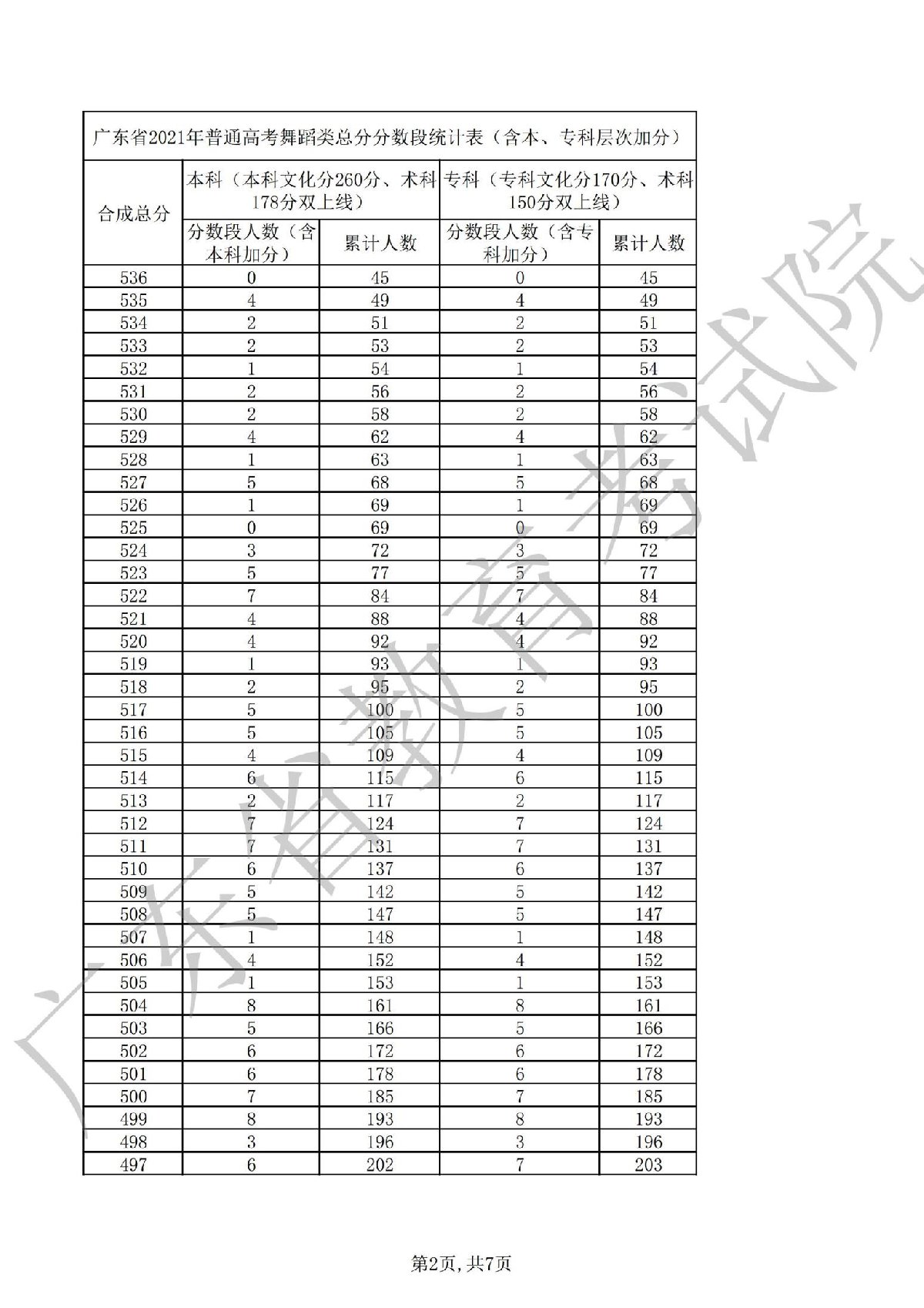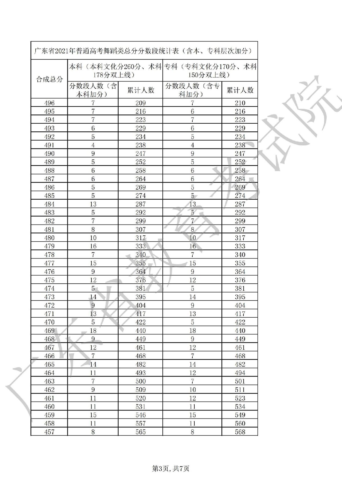 广东省2021年普通高考舞蹈类总分分段统计表