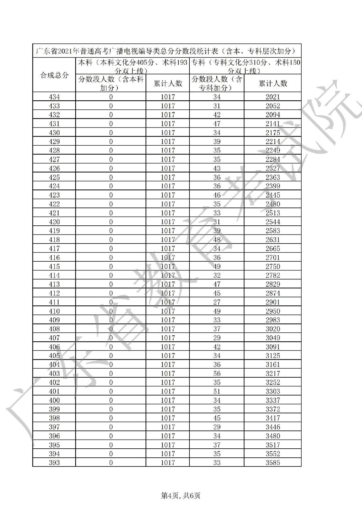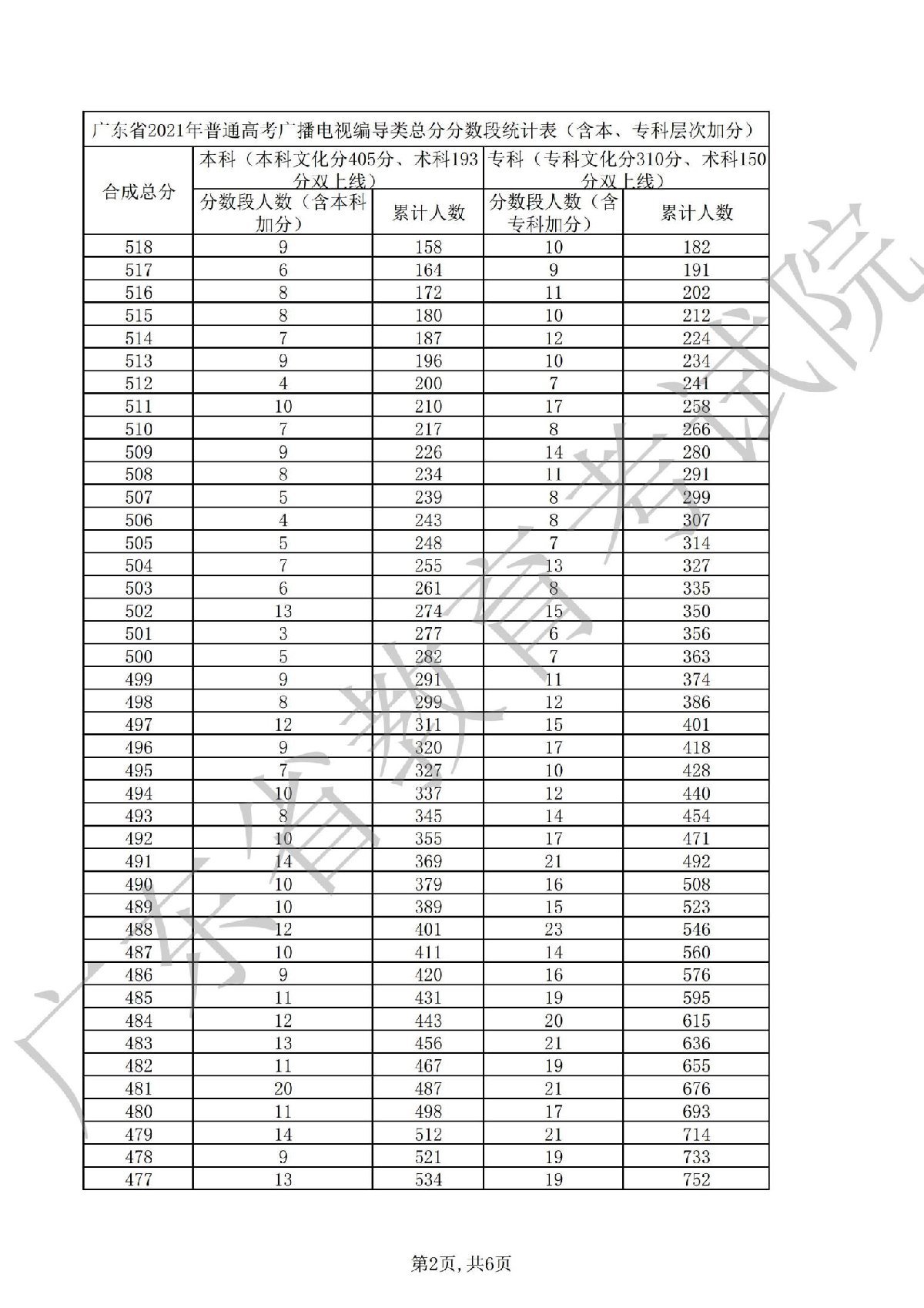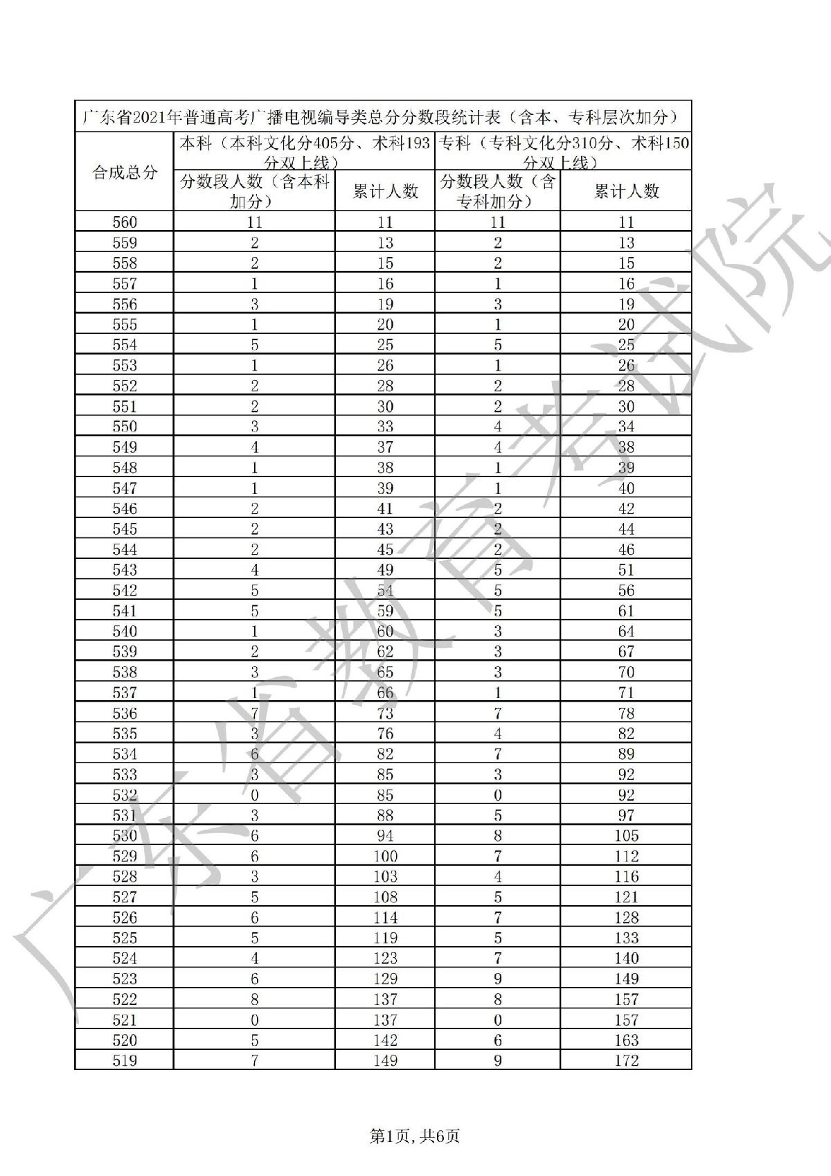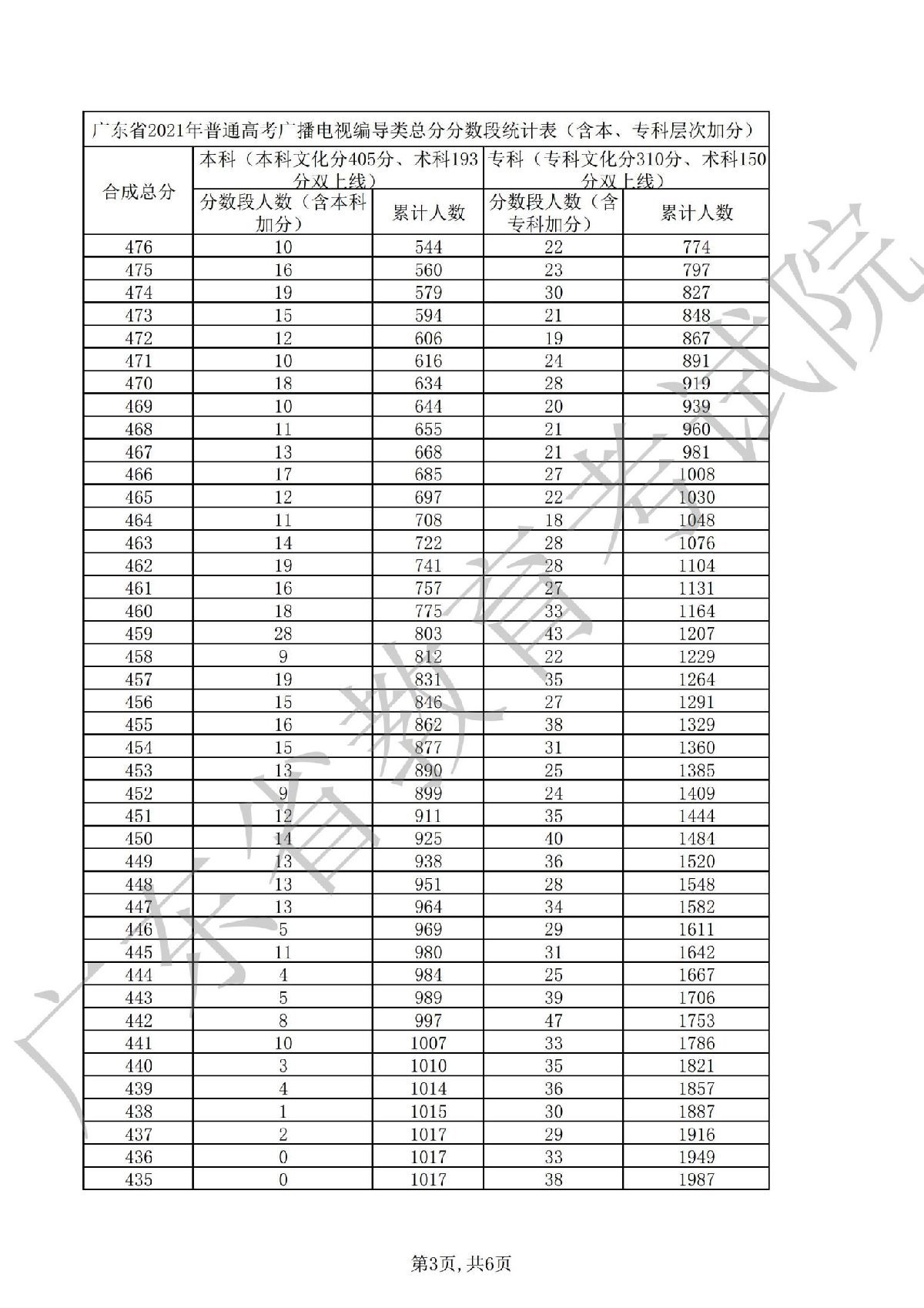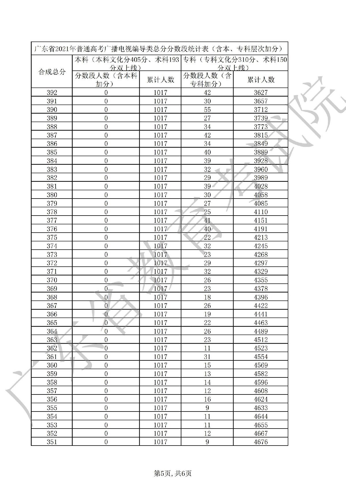 广东省2021年普通高考广播电视编导类总分分段统计表