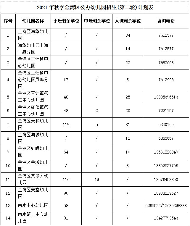 2021珠海金湾区公办幼儿园第二轮招生计划