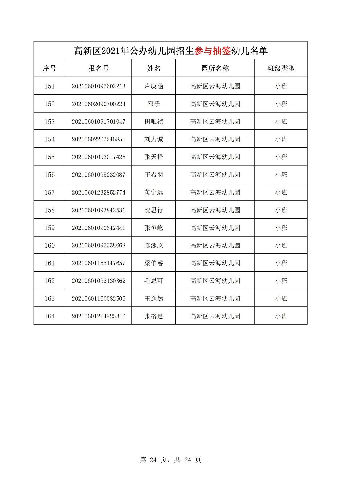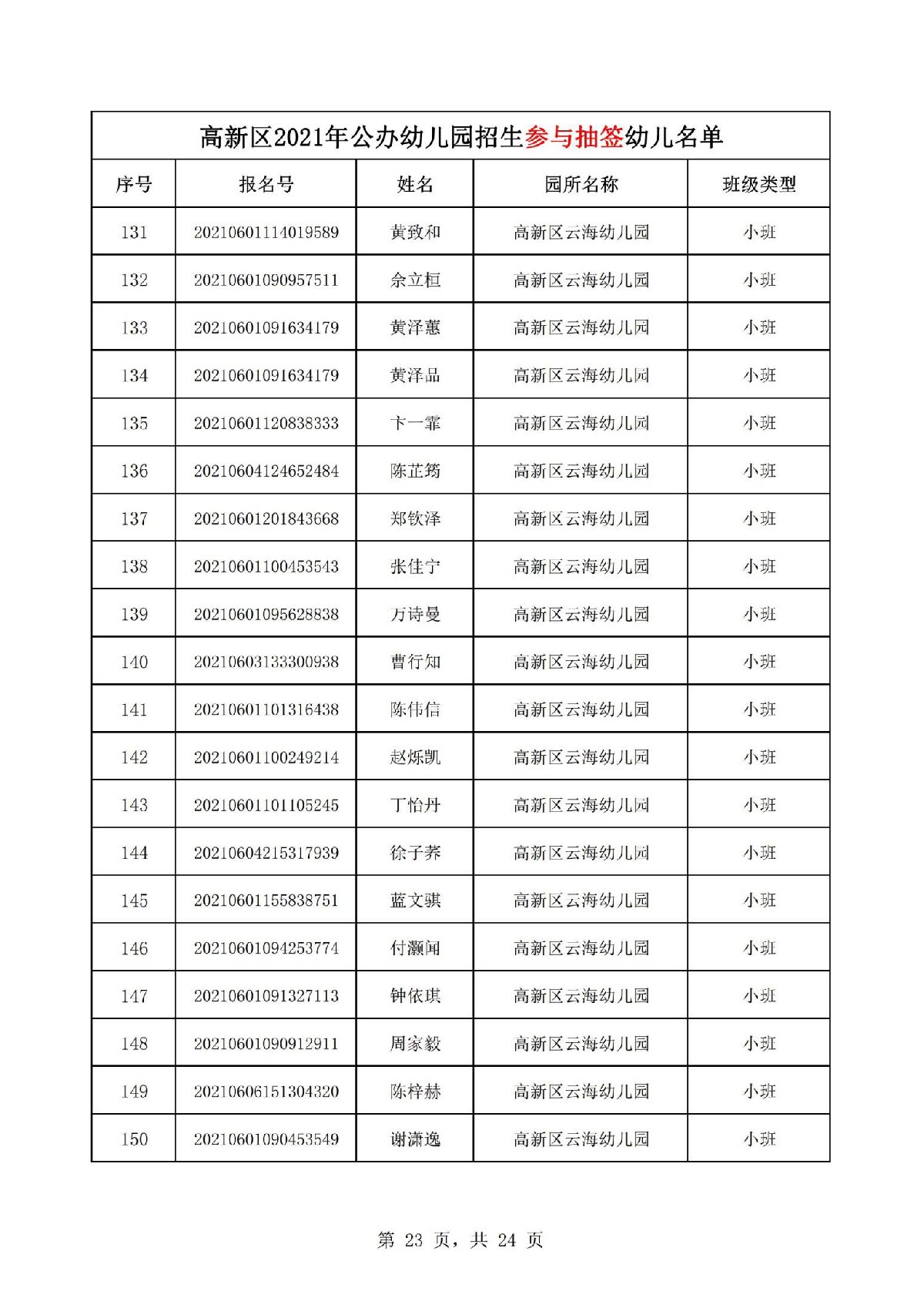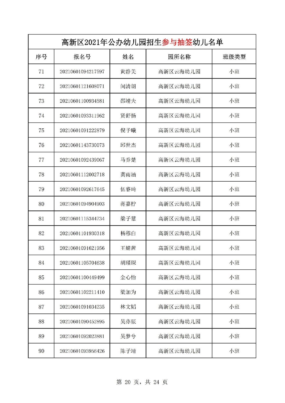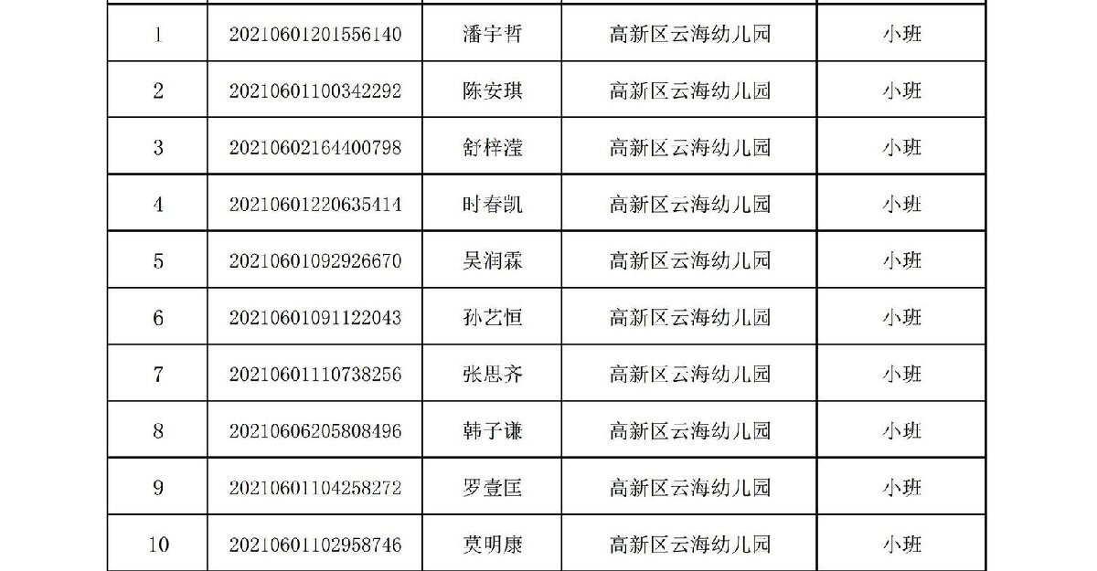珠海高新区云海幼儿园2021年招生参与抽签名单