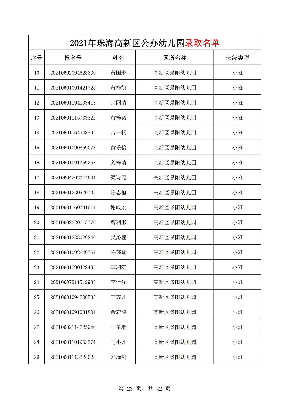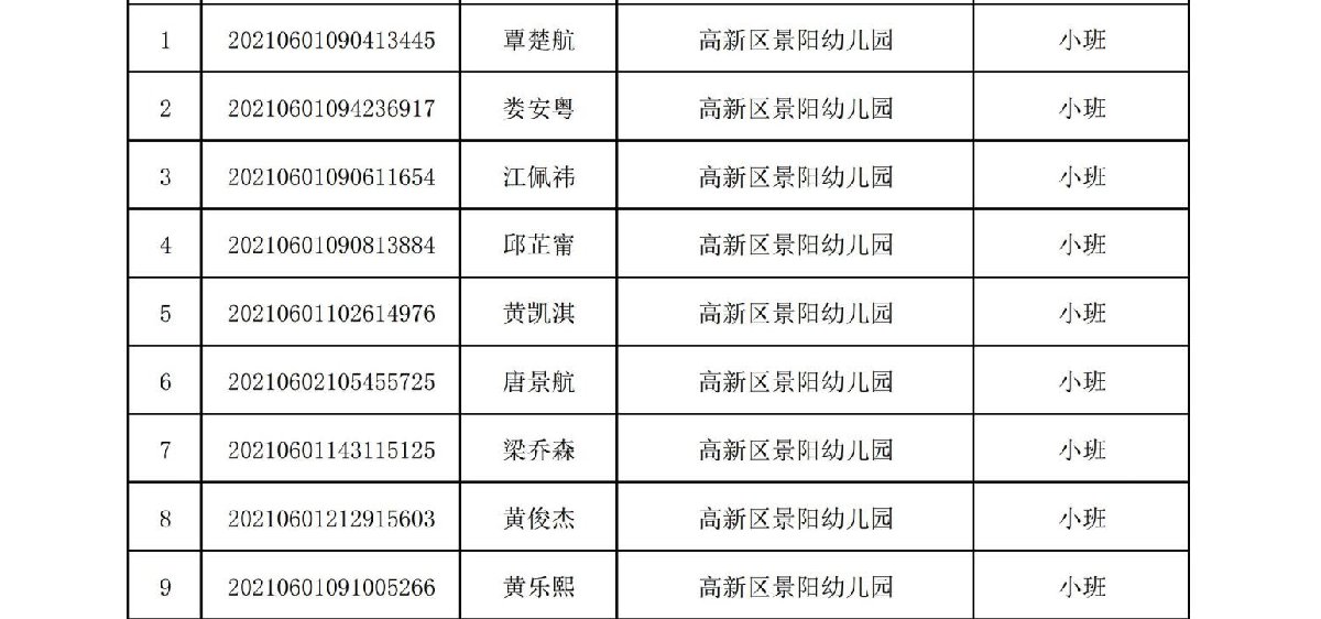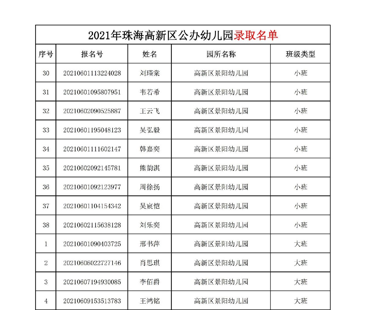 珠海高新区景阳幼儿园2021年录取名单
