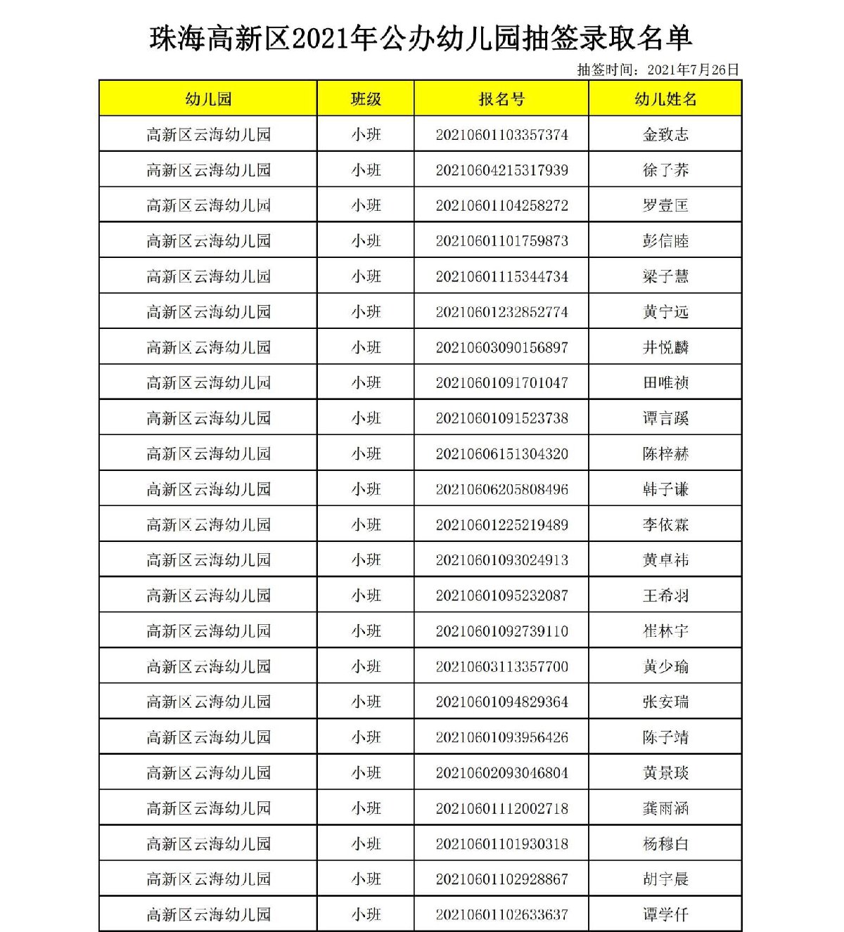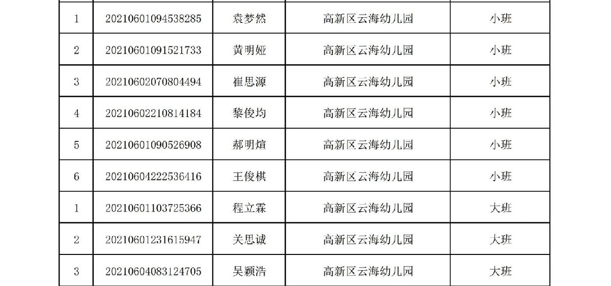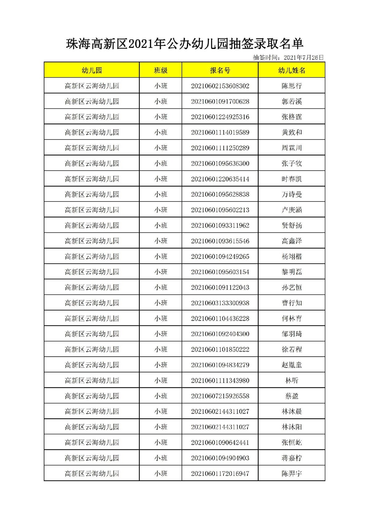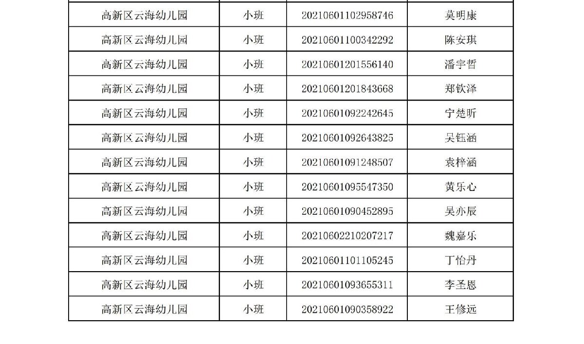 2021珠海高新区云海幼儿园正式录取名单(最新消息)
