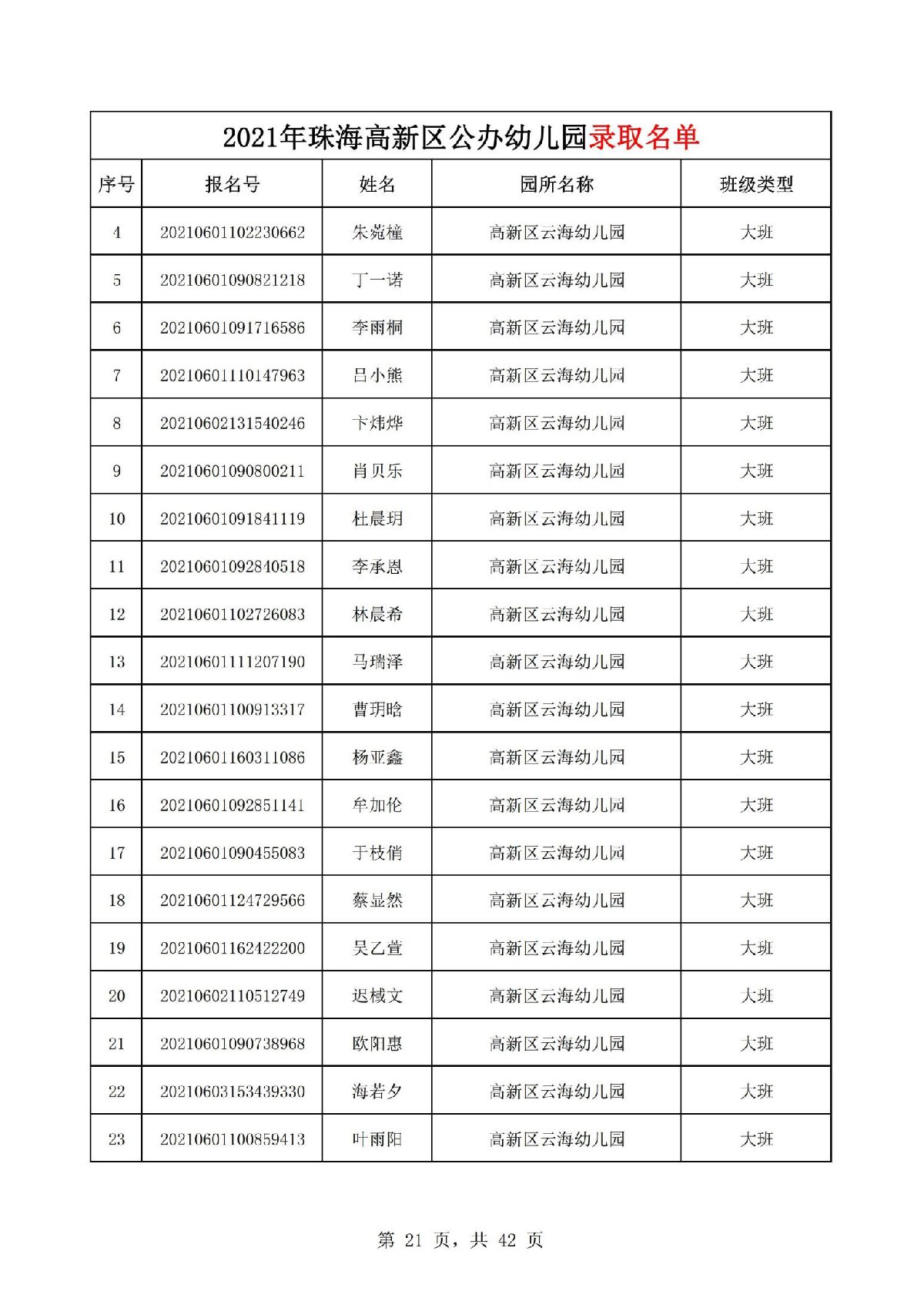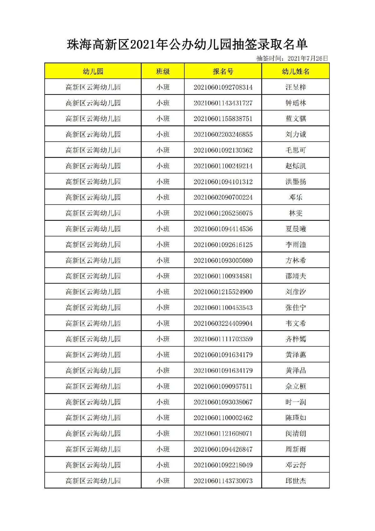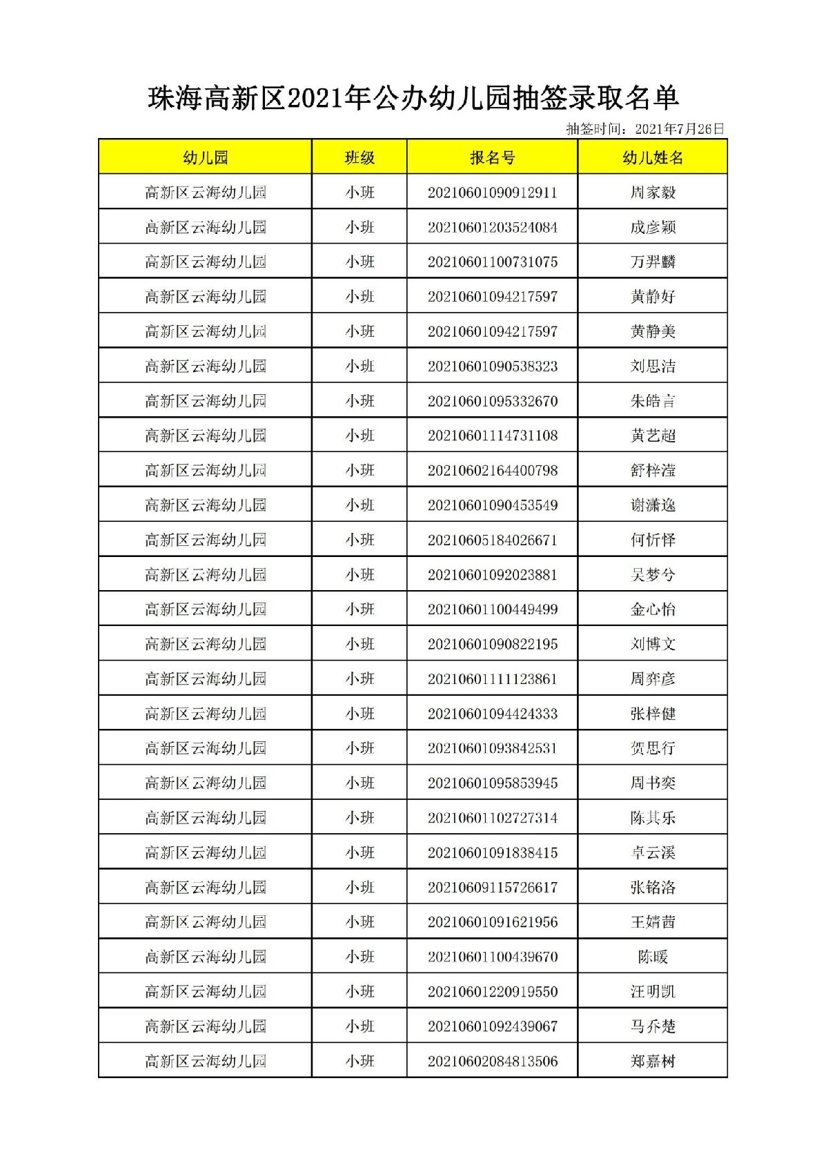 2021珠海高新区云海幼儿园正式录取名单(最新消息)