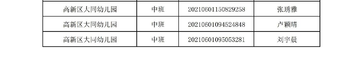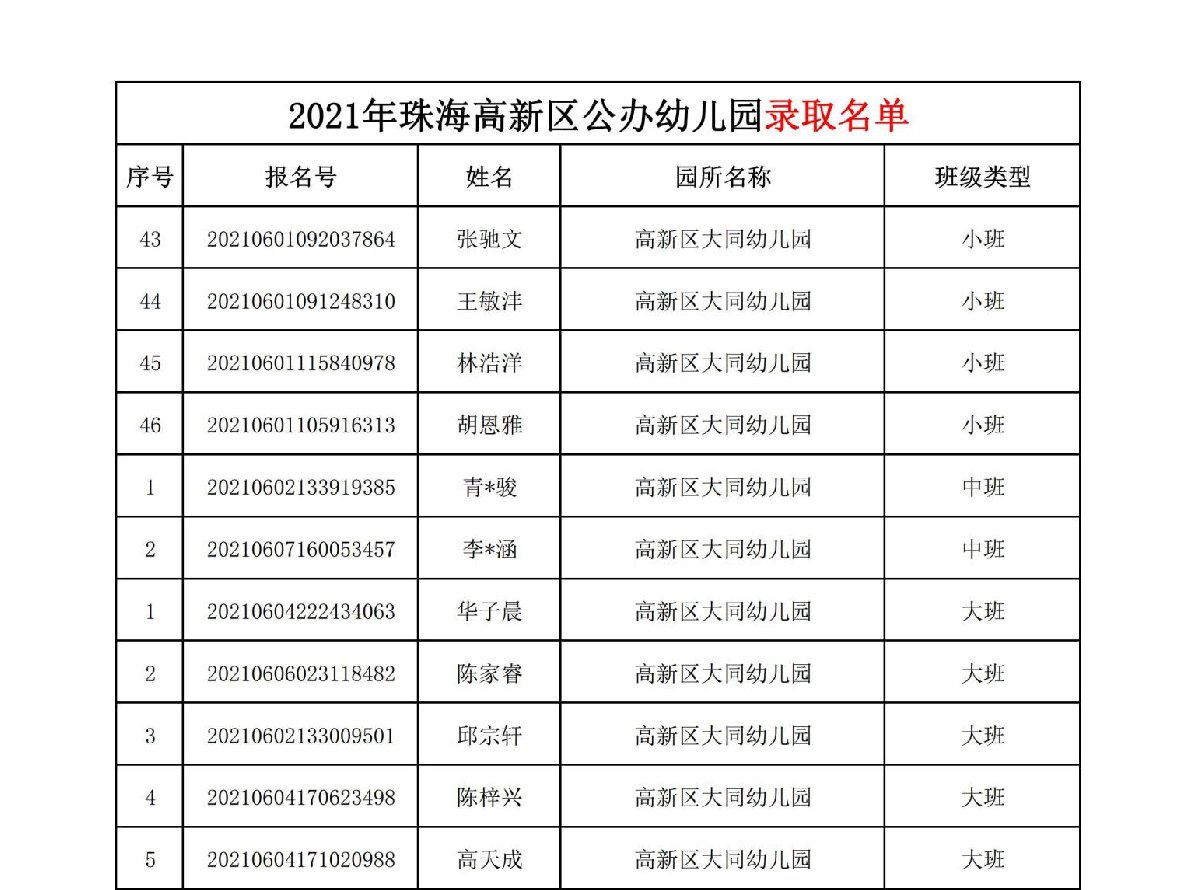 2021珠海高新区大同幼儿园录取名单