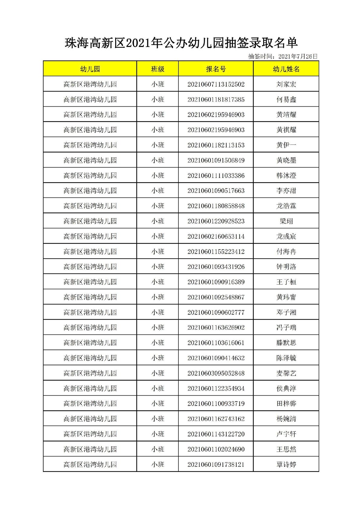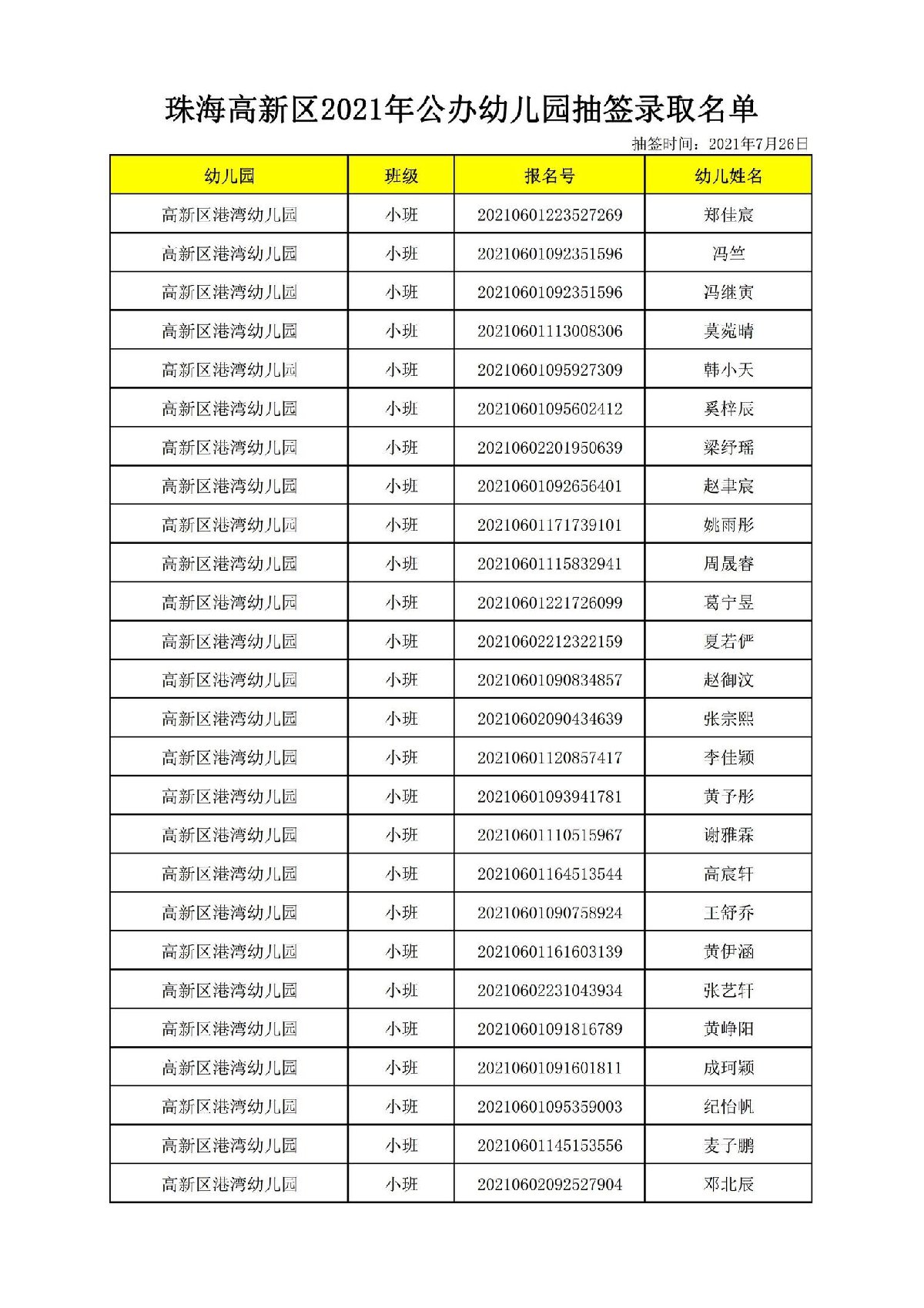 2021珠海高新区港湾幼儿园录取名单