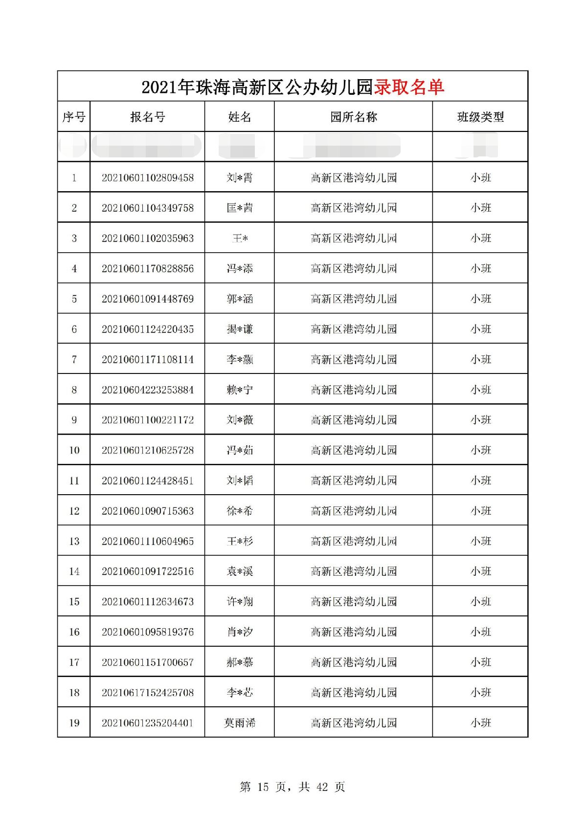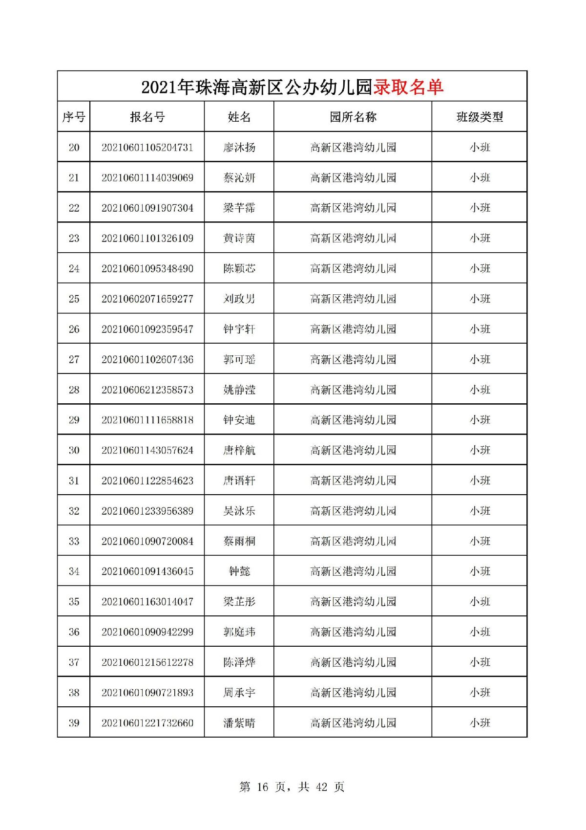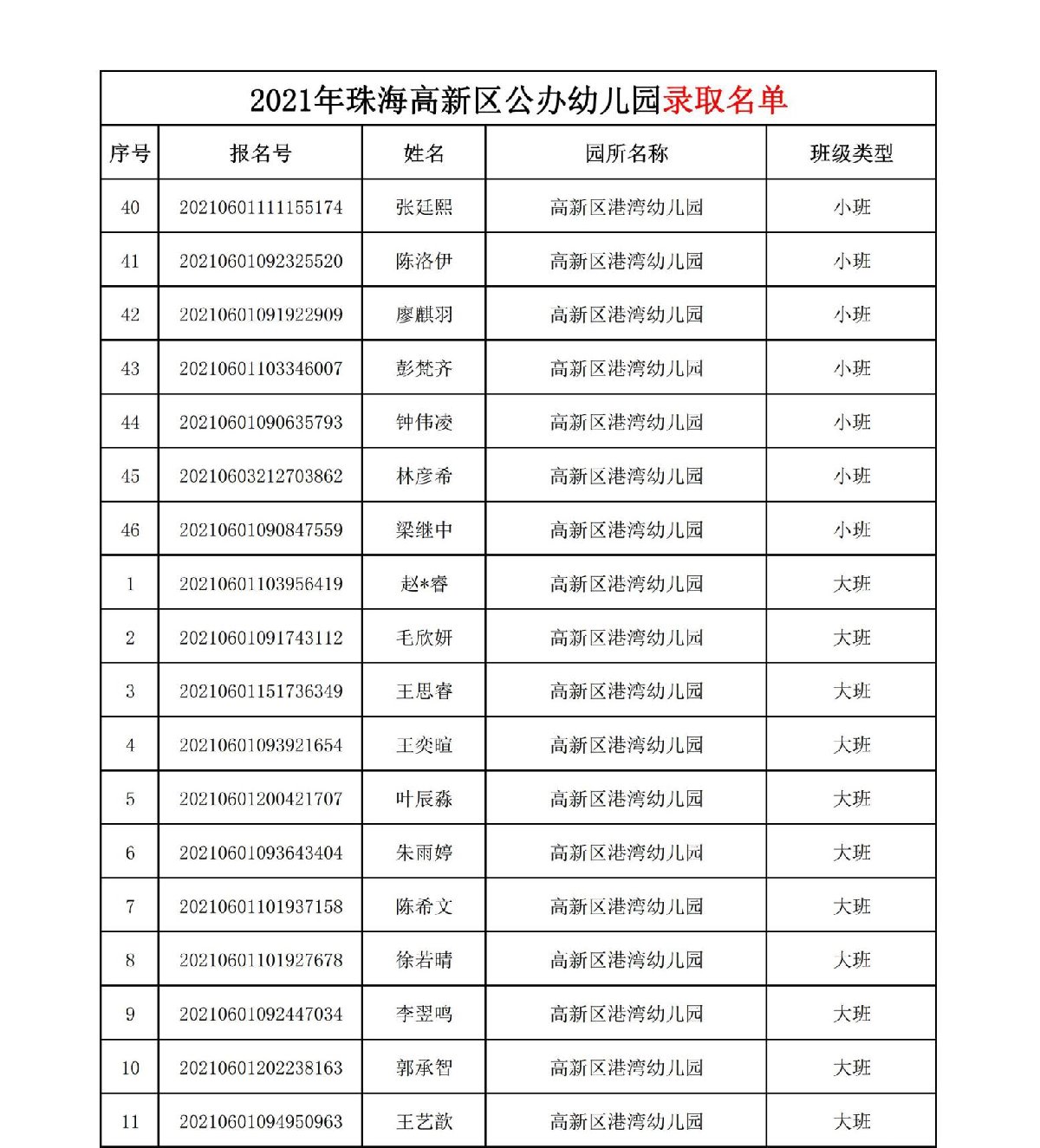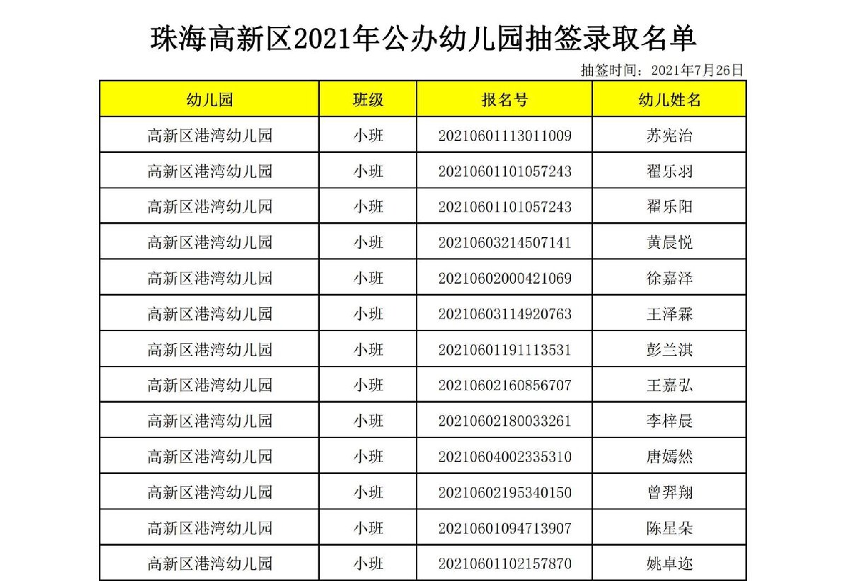 2021珠海高新区港湾幼儿园录取名单(珠海市新港幼儿园)