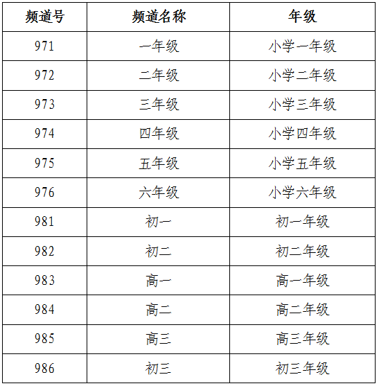 各年级课程内容均由指定电视频道播出,分别对应中小学各年级的课程内容,频道号如下: