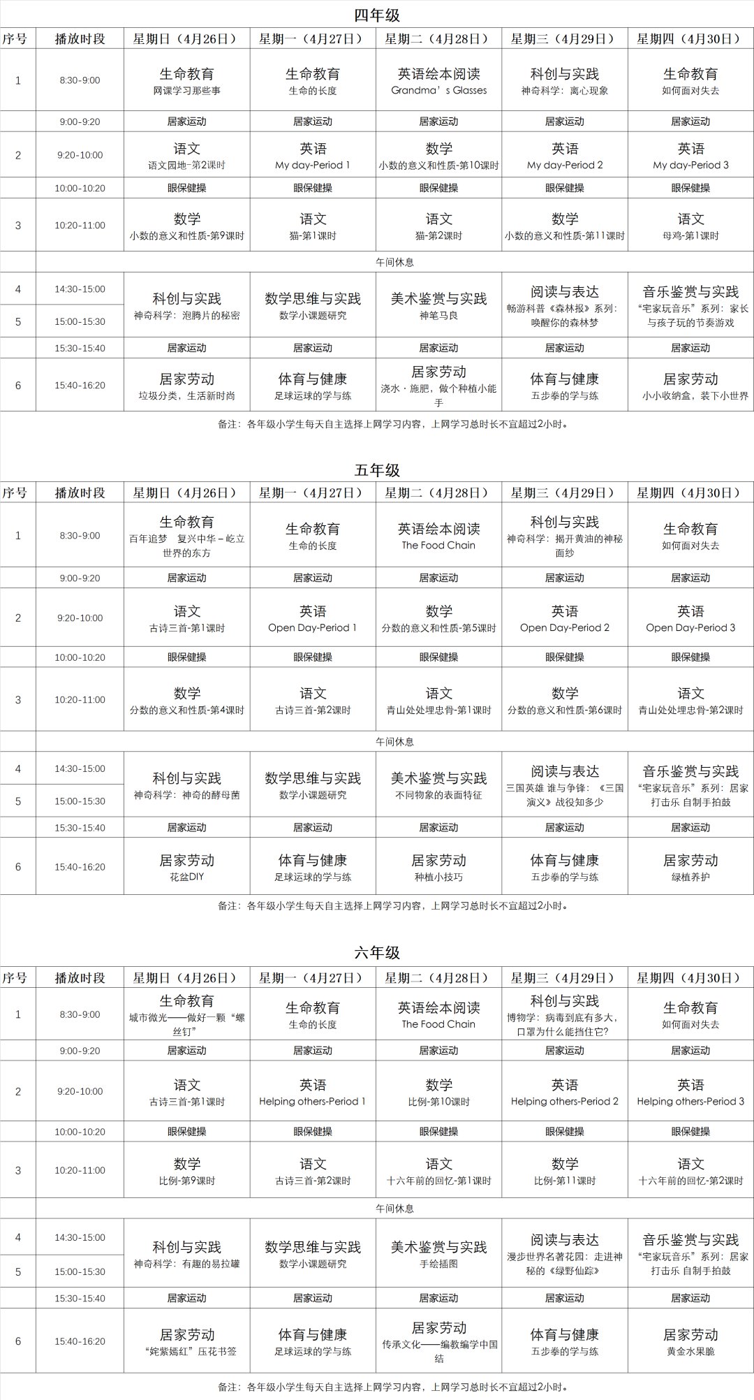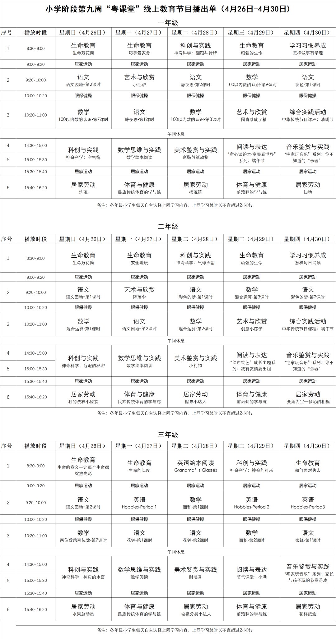 小学阶段第九周“粤课堂”线上教育节目播出单(4月26日-4月30日)
