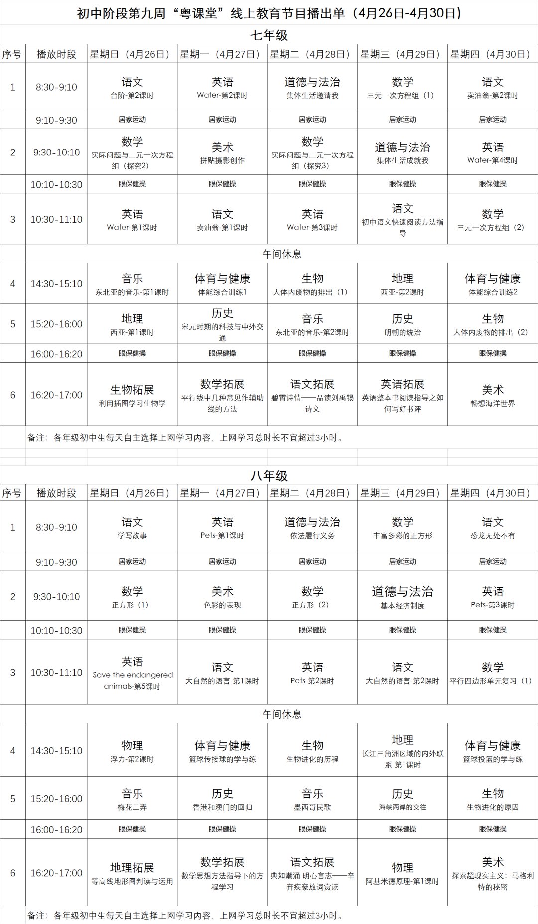 初中阶段第九周“粤课堂”线上教育节目播出单(4月26日-4月30日)