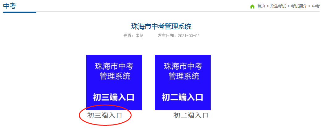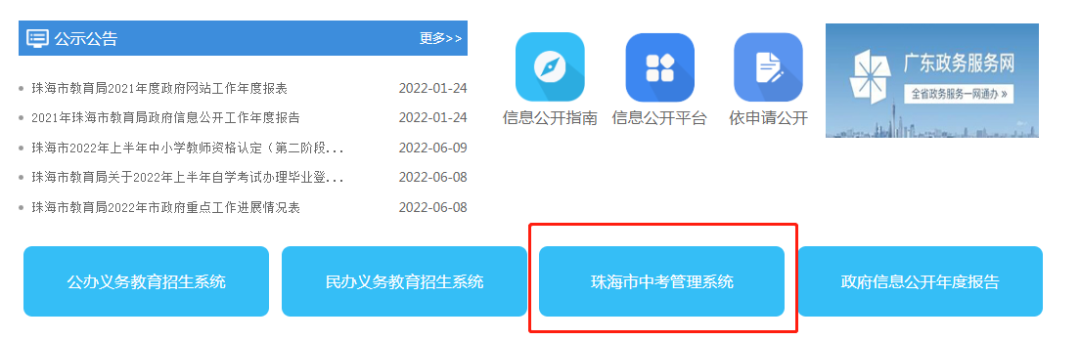 ▲如图所示,进入官网之后,点击页面下方“珠海市中考管理系统”按钮,再选择“初三端入口”,进入系统查询成绩。