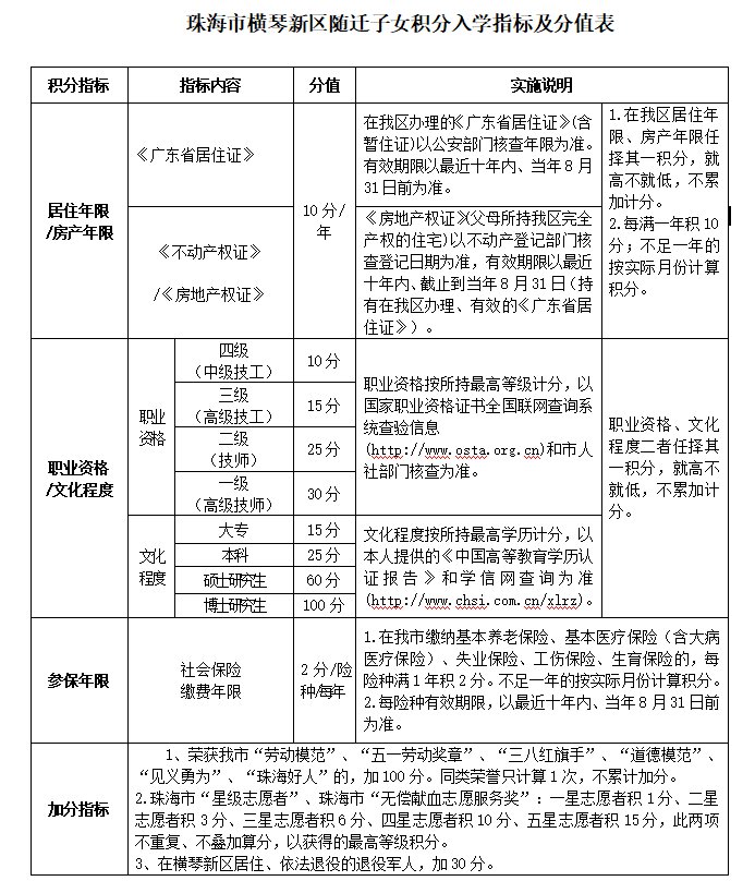 第四条 随迁子女积分入学设置居住年限(或区内完全产权房产登记年限)、职业资格(或文化程度)、参保年限和加分项目。具体积分指标及分值详见《珠海市横琴新区随迁子女积分入学指标及分值表》。