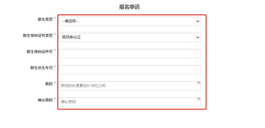➤依次选择新生类型、身份证类型、填写新生身份证号等相关信息,点击【开始报名】