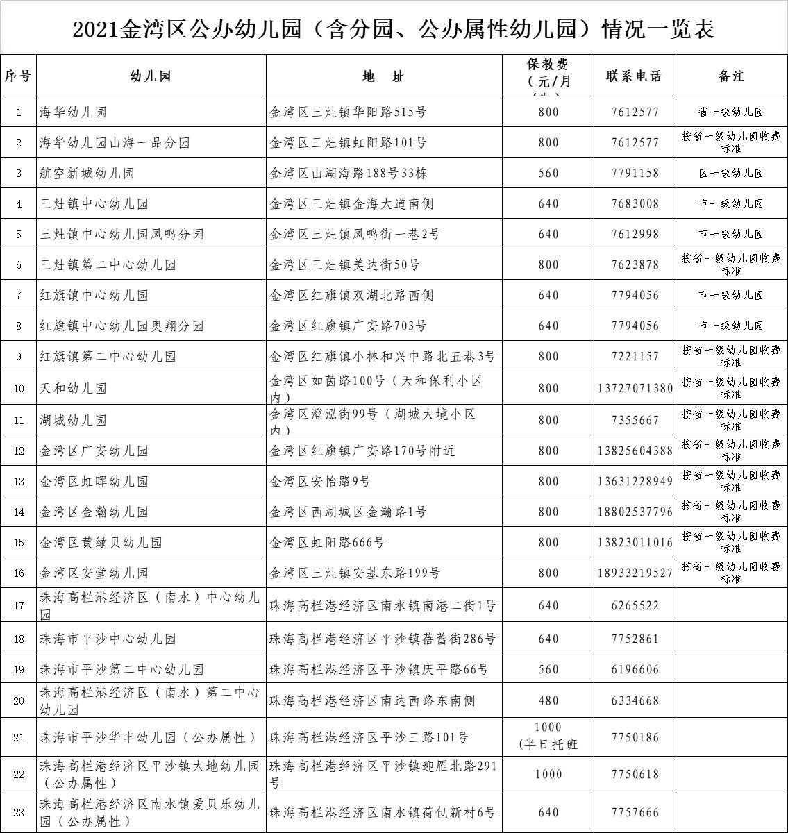 【2021金湾区公办幼儿园(含分园、公办属性幼儿园)情况一览表】