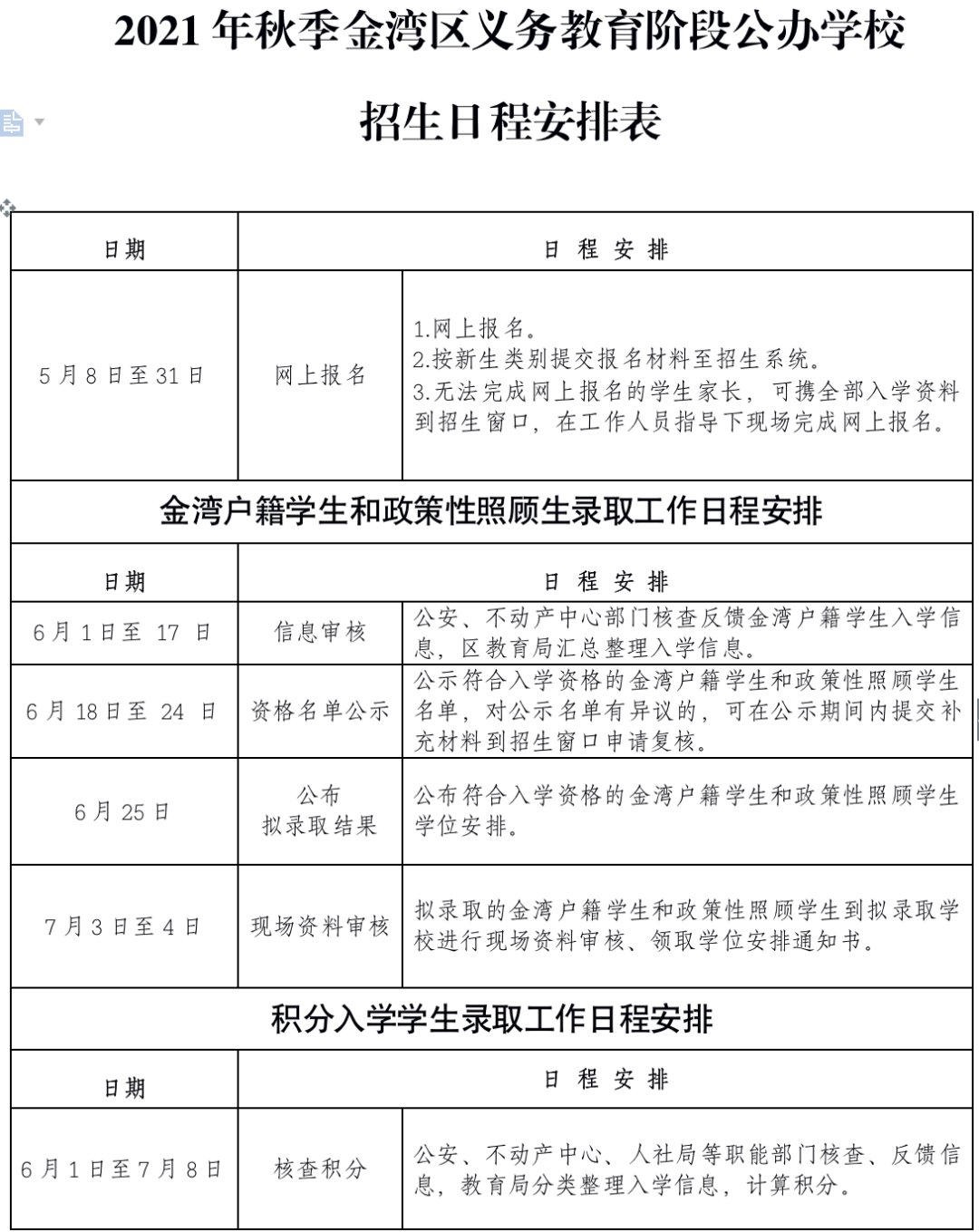 2021秋季各区公办中小学招生日程安排表一览(持续更新)