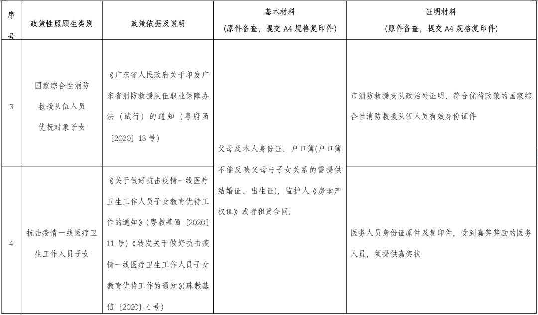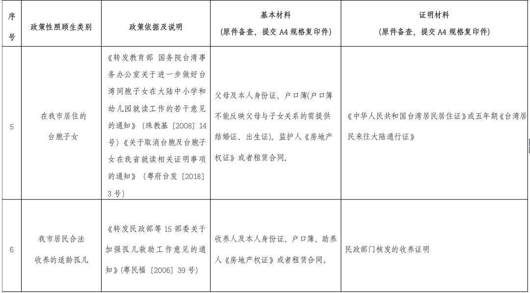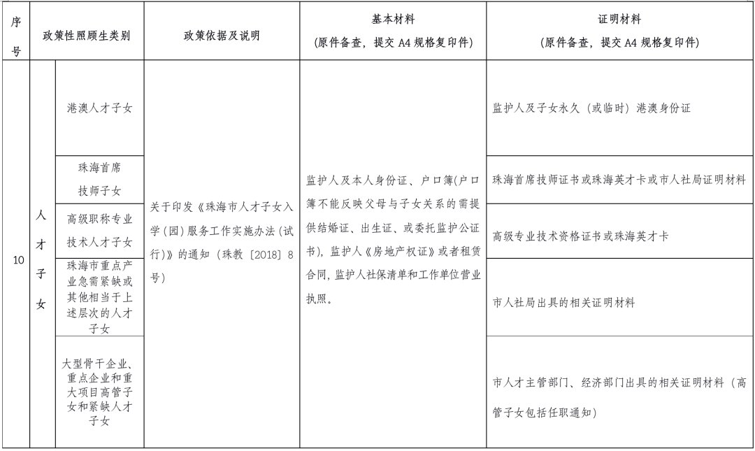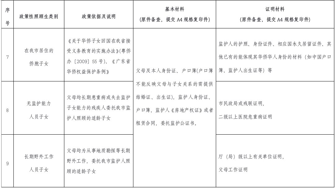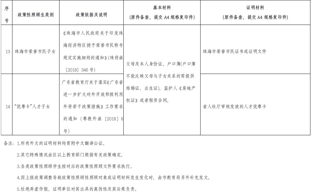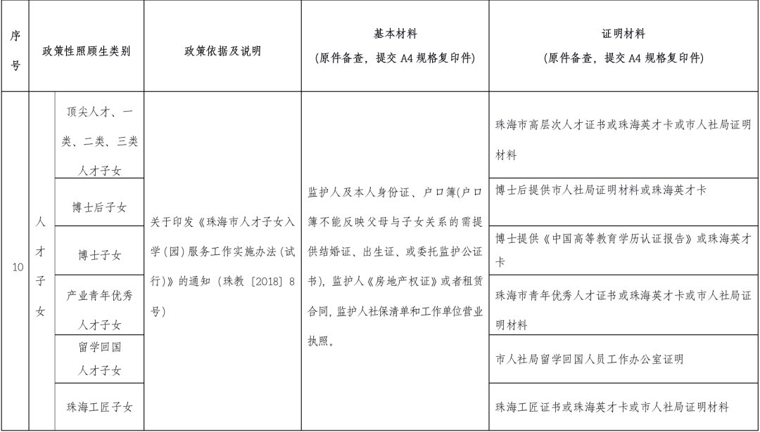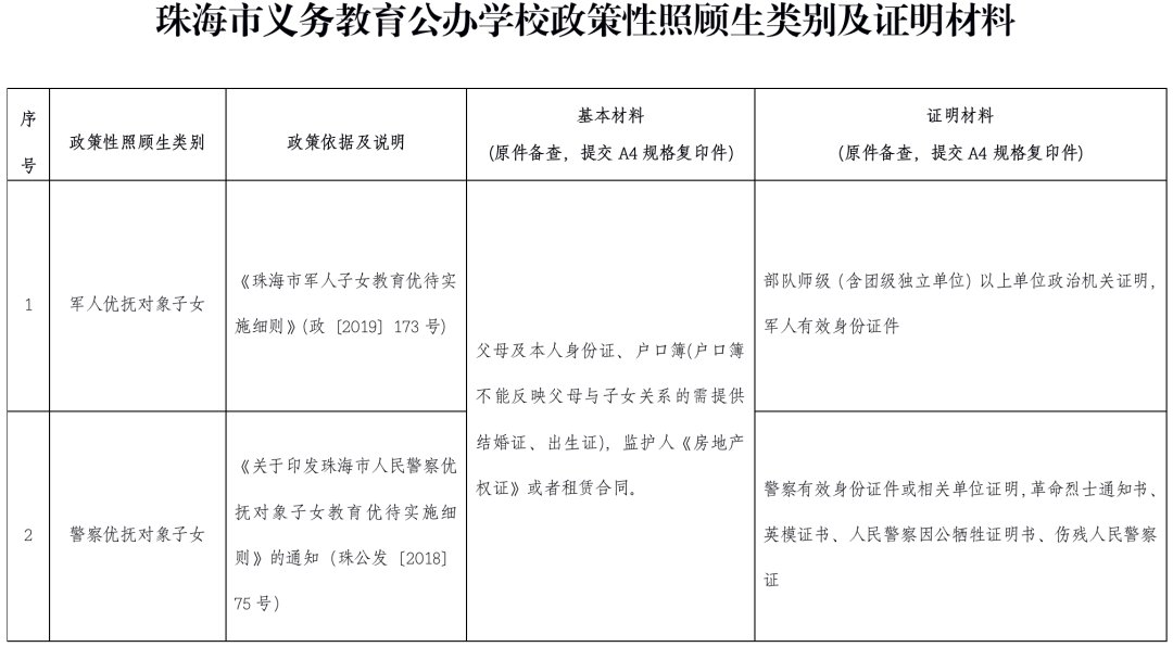 2.珠海市义务教育阶段公办学校政策性照顾生类别及证明材料一览表