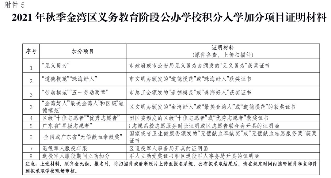 5.2021年秋季金湾区义务教育阶段公办学校招生积分入学加分项目证明材料