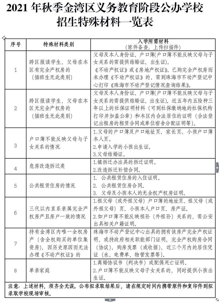 4.2021年秋季金湾区义务教育阶段公办学校招生特殊材料一览表