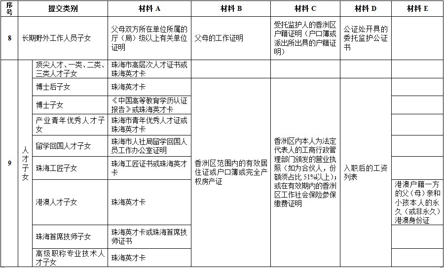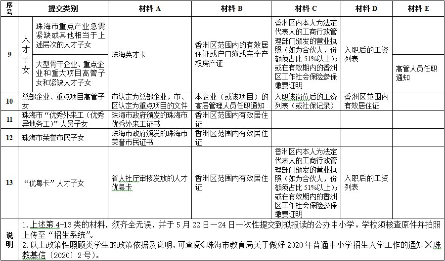 2020年秋季珠海市义务教育阶段公办学校政策性照顾生证明材料一览表