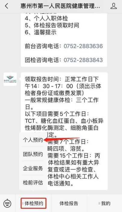 体检方式:通过“惠州市第一人民医院健康管理中心微信公众号”登录健康体检平台,进行体检预约;按照预约的时间凭有效身份证原件到体检中心前台领取体检指引单。(注:只接受线上预约,不接受现场开单)