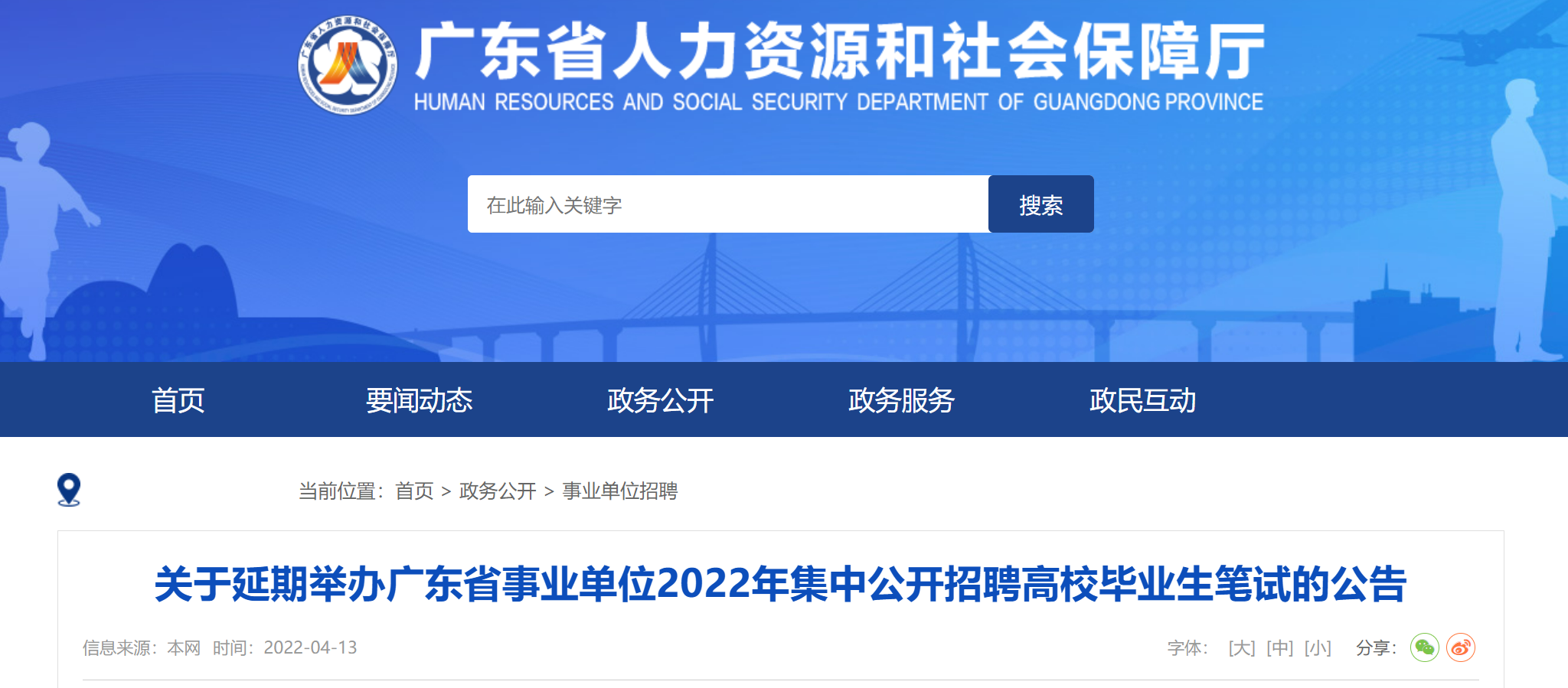 广东省事业单位2022年集中公开招聘高校毕业生笔试延期