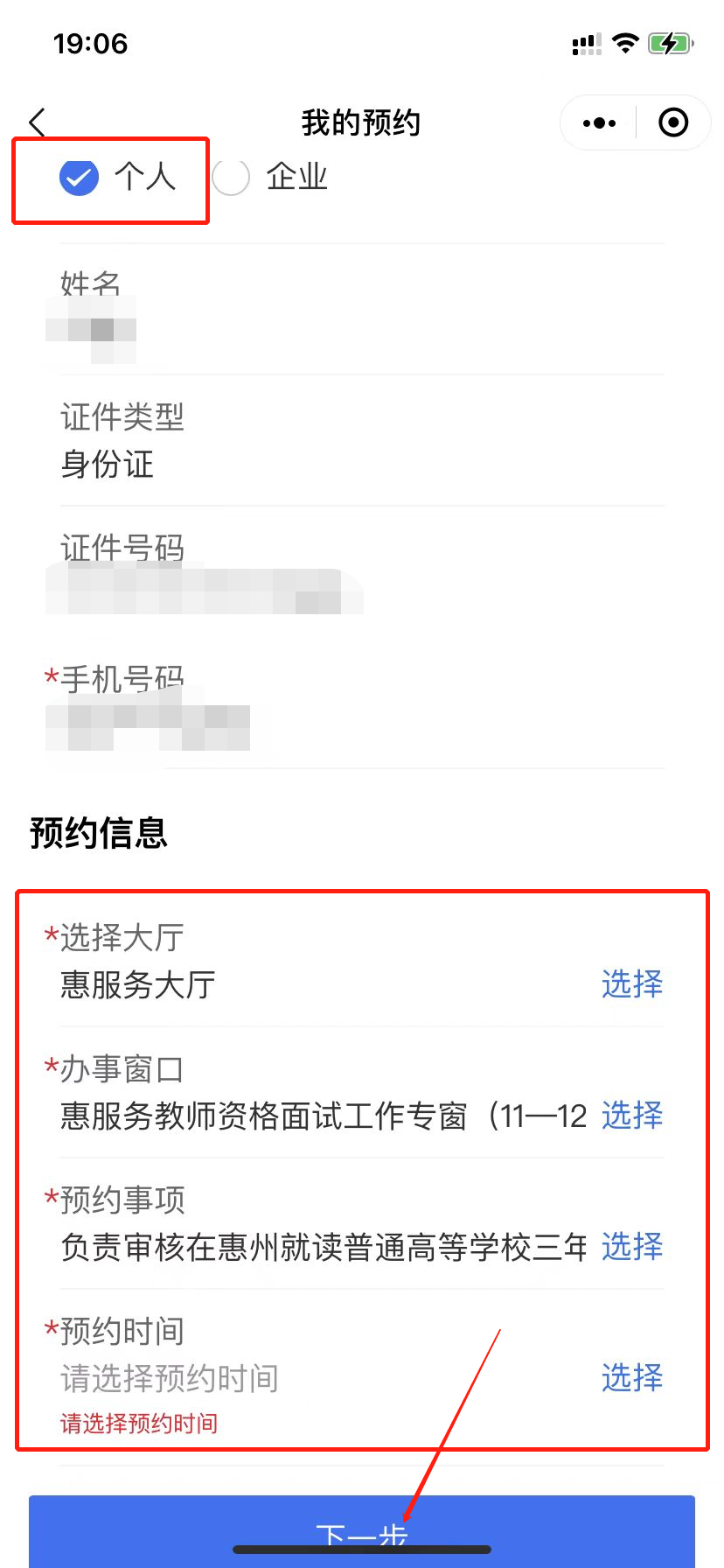②办事人类型选择“个人”,预约信息中,大厅选择“惠服务大厅”,办事窗口选择“惠服务教师资格考试面试现场审核工作专窗”,服务事项选择“负责审核在读的普通高等学校三年级及以上的全日制本科学生、毕业学年的全日制专科学生和港澳台及特殊教育、日语、俄语报名的考生、驻惠部队考生”;