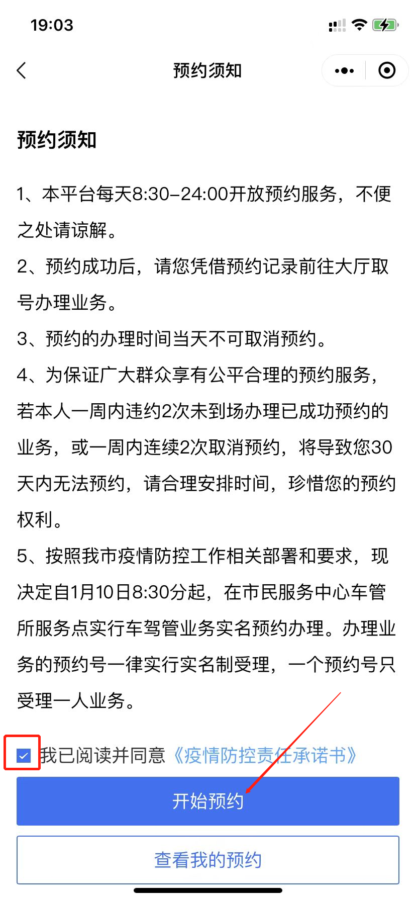 ①勾选同意承诺书,点击开始预约,进入下一页;