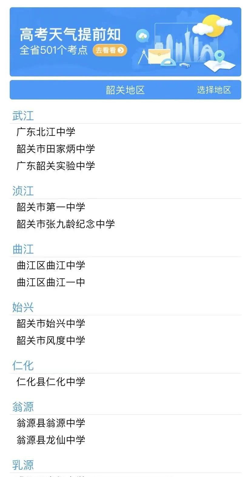 (2)地区选择为“韶关市”,即可查看考点的天气。