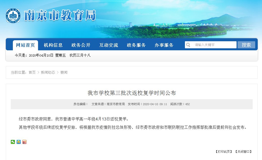 经市委市政府同意,2020年南京市普通中学初二、高二年级4月7日返校复学。