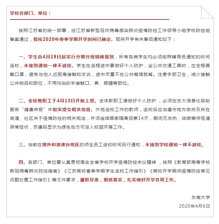 东南大学2020分期分批错峰开学安排 东南大学什么时候出分
