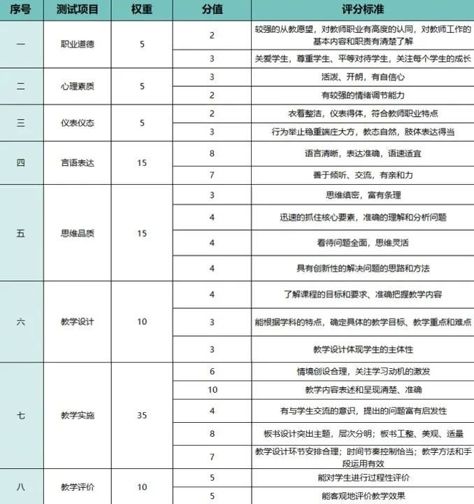 2.全国统考教师资格的面试总分为100分,考生成绩由各分项得分累加而得,各分项的分值由面试考试大纲规定。