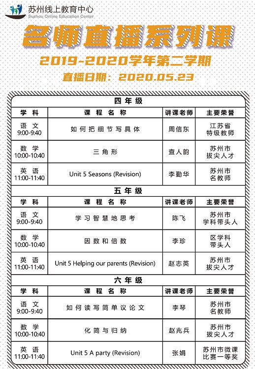 苏州线上教育中心5月23日小学直播课课表