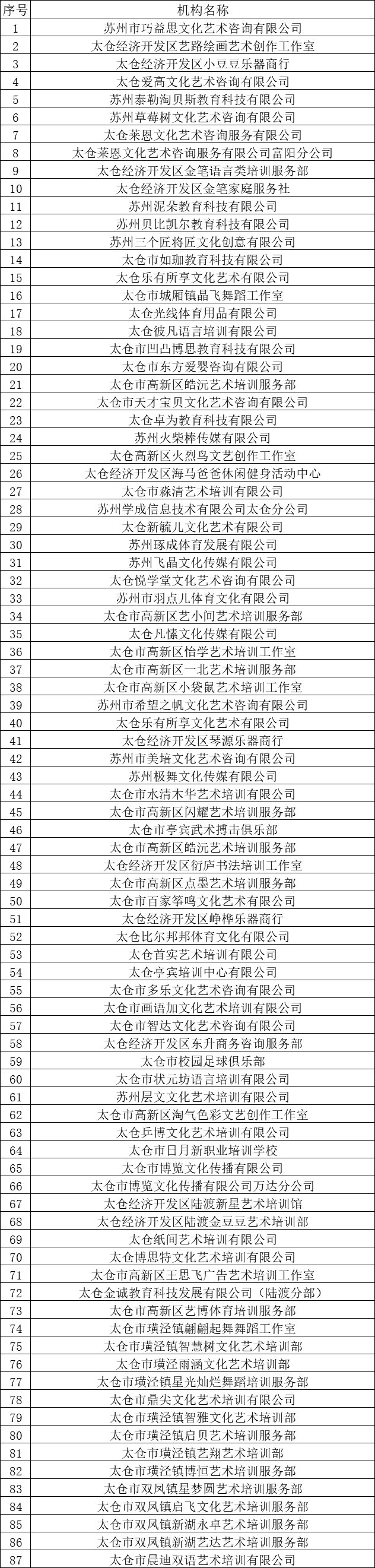 根据太仓市新冠病毒感染的肺炎疫情防控指挥部学校防控组《关于做好太仓市校外培训机构有序恢复线下集中培训工作的通知》(太校防组〔2020〕29号)文件精神,经各培训机构自主申报,各区镇(街道)验收小组现场验收、市学校防控组审核,并报市新冠肺炎疫情防控指挥部批准,现将第一批87家具有营业执照,并已通过验收准予复课的培训机构名单向社会公布,即日起可以恢复线下集中培训活动(面向6岁及以下儿童的培训业务需在幼儿园全面复课之后开展)。