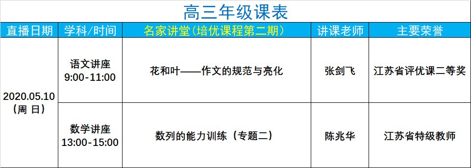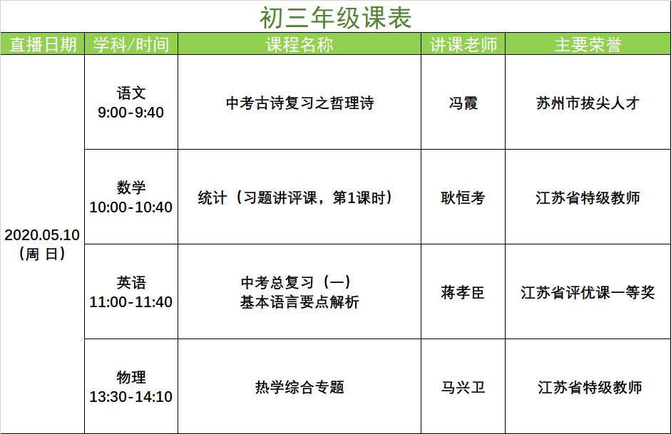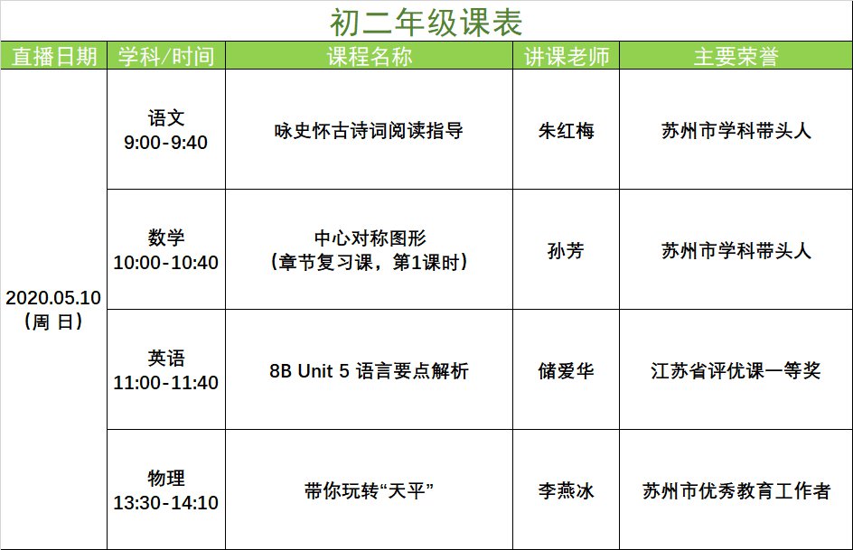2019至2020第二学期直播课程将于5月10日开讲!本期课程主要以直播课的形式,教学内容为对一周在校学习内容的梳理总结和提升。直播时长小学20分钟讲授,10分钟互动交流;初高中30分钟讲授,10分钟互动交流。授课教师均来自于苏州大市精选的名师。