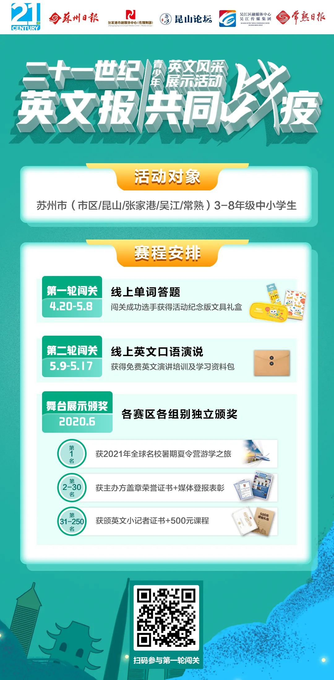 在“共同战疫”的大主题下,为了帮助青少年传播科学、展示英文风采、提升简历背景、获得具有含金量的证书,同时给秋季2020二十一世纪杯预热,《二十一世纪英文报》“青少年英文风采展示”公益活动,诚邀全市中小学生积极参与!通过抗击疫情主题英文展示活动,让阅读的习惯展现素养,用青春的声音鼓舞社会,用知识的力量传播科学。