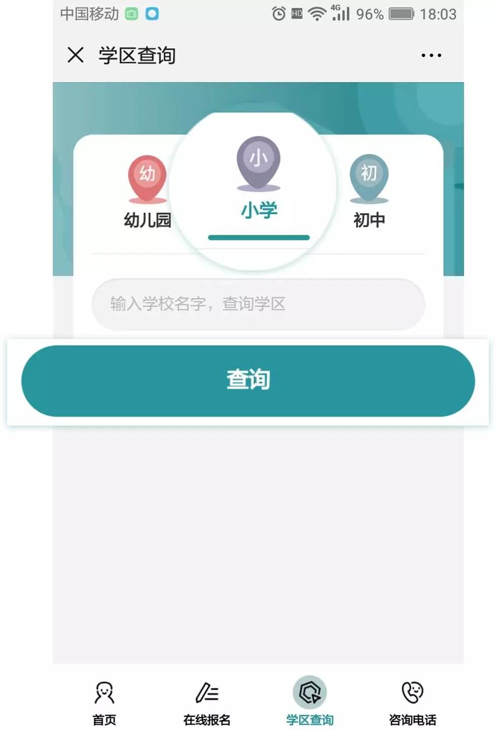 在报名前可先点击界面下方标签栏中的【学区查询】来查询所报学校信息,可以任意选择幼儿园、小学、初中进行查询。如(图29)。