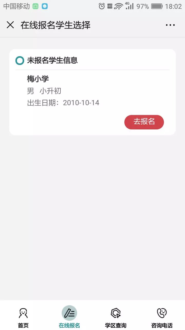 点击选择之前注册好的小升初的信息,即为该新生进行报名 如(图24)。