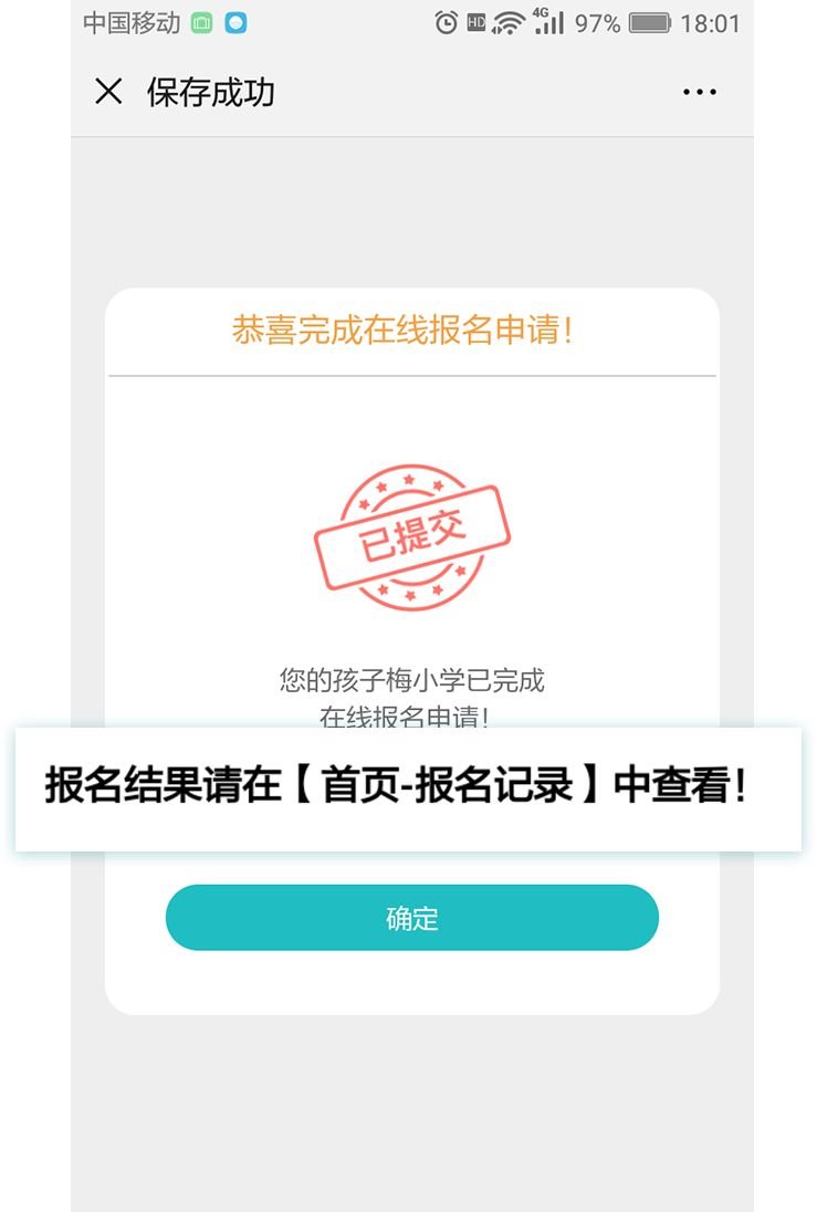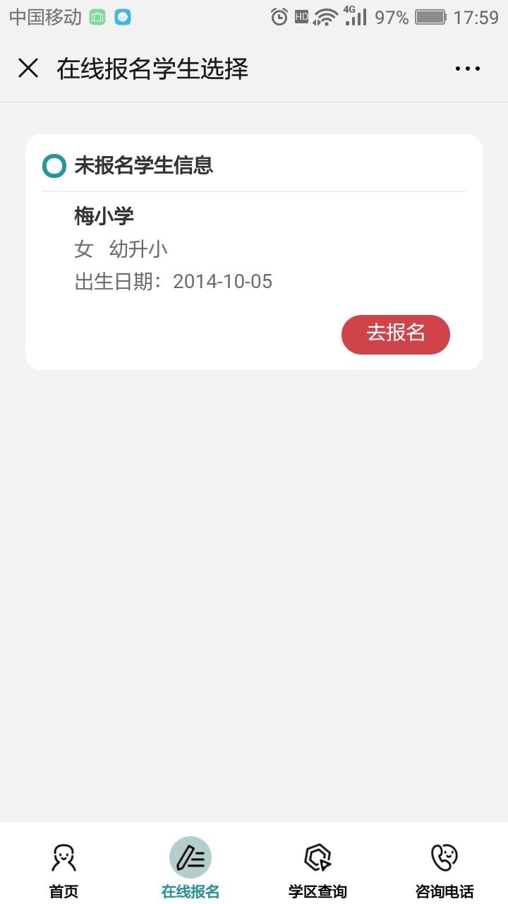 点击选择之前注册好的幼生小的信息,即为该新生进行报名 如(图19)。