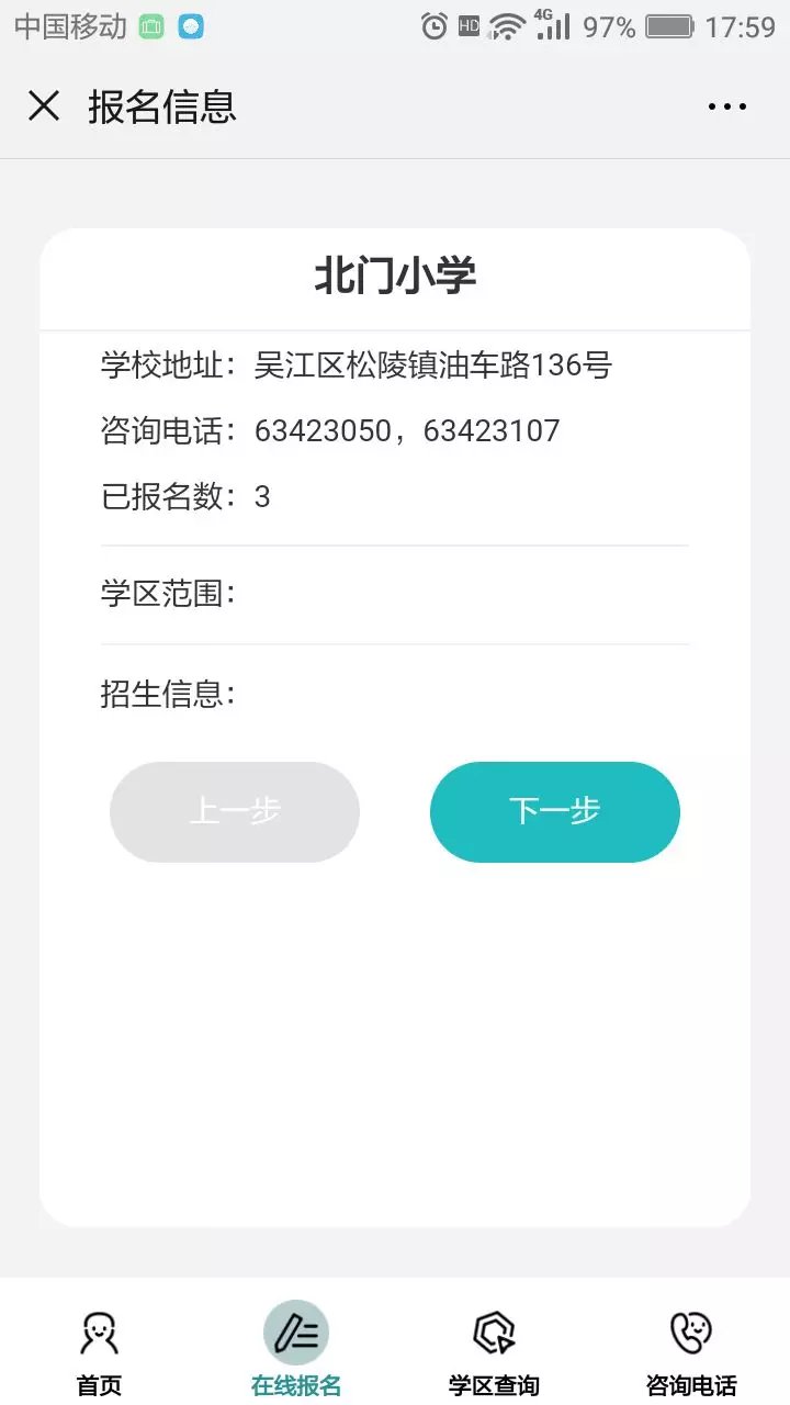 选择报名学校后先查看下该学校的基础信息,确认无误后点击下一页开始填报名资料 如(图21)。
