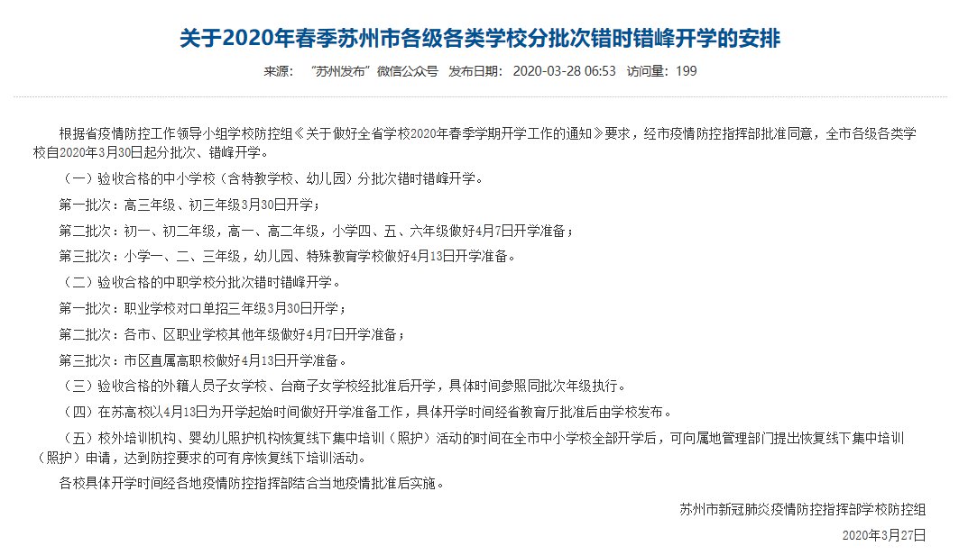 就在昨日(3月30日),苏州市各初三、高三学生已开学,其他的年级也将根据通知分批次、错时错峰开学