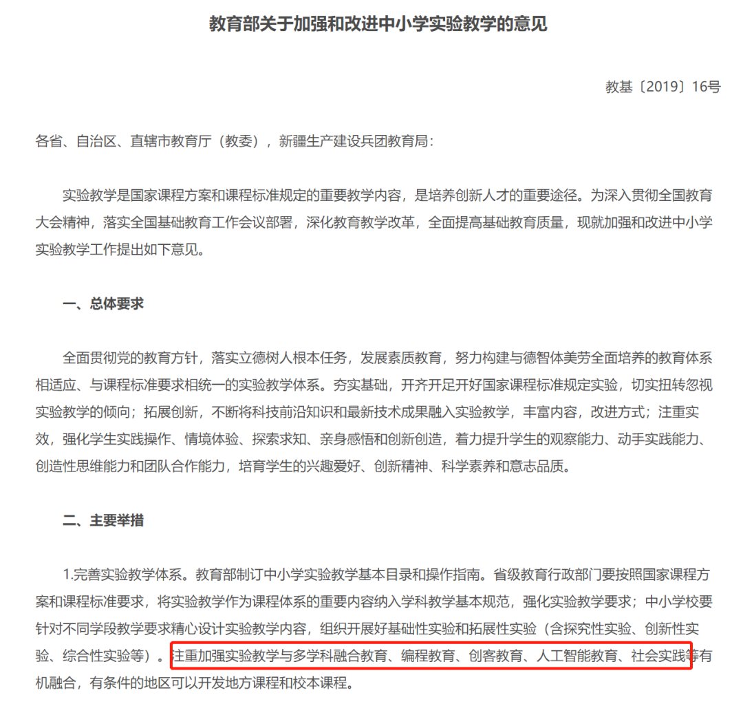 而早在2019年3月14日,教育部官宣,将在中小学里开始推广编程教育,并将启动中小学生信息素养测评,推动在中小学阶段设置人工智能相关课程,逐步推广编程教育,在浙江、南京、山东等地,已陆续把编程列到学生日常课程和招生上。