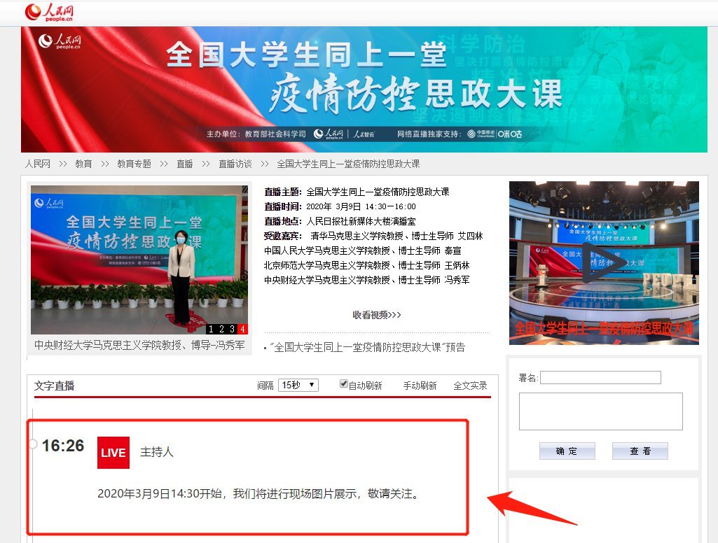 教育部社会科学司、人民网将联合举办“全国大学生同上一堂疫情防控思政大课”。3月9日14:30至16:00,全国高校学生可通过人民网教育频道、人民网人民智云客户端、咪咕视频客户端等同步收看直播。