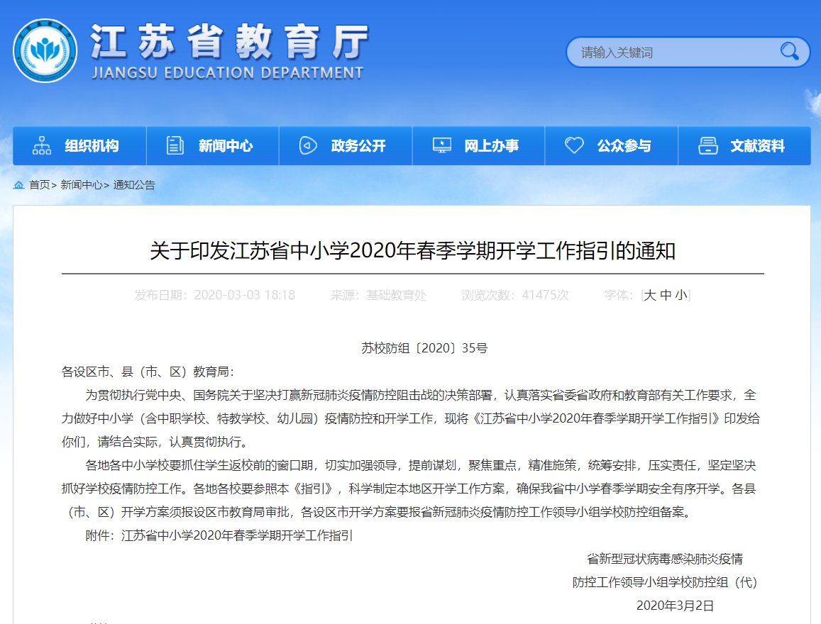 根据2020年3月3日,江苏省新型冠状病毒感染肺炎疫情防控工作领导小组学校防控组(代)发布的《中小学春季学期开学工作指引20条》指出: