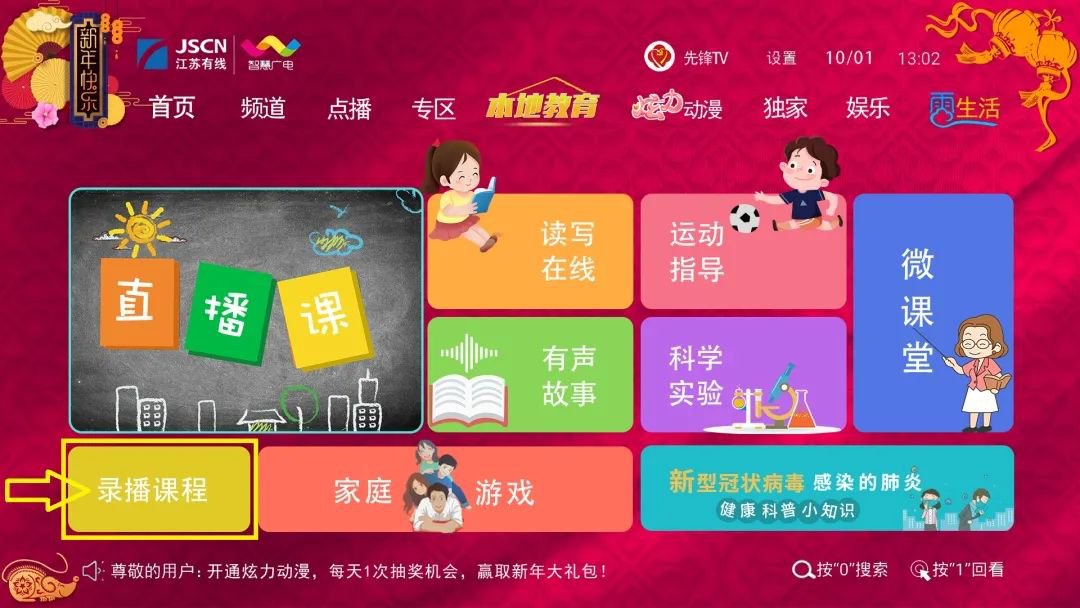 收看途径:打开江苏有线高清机顶盒首页,选择“本地教育”进入“录播课程”