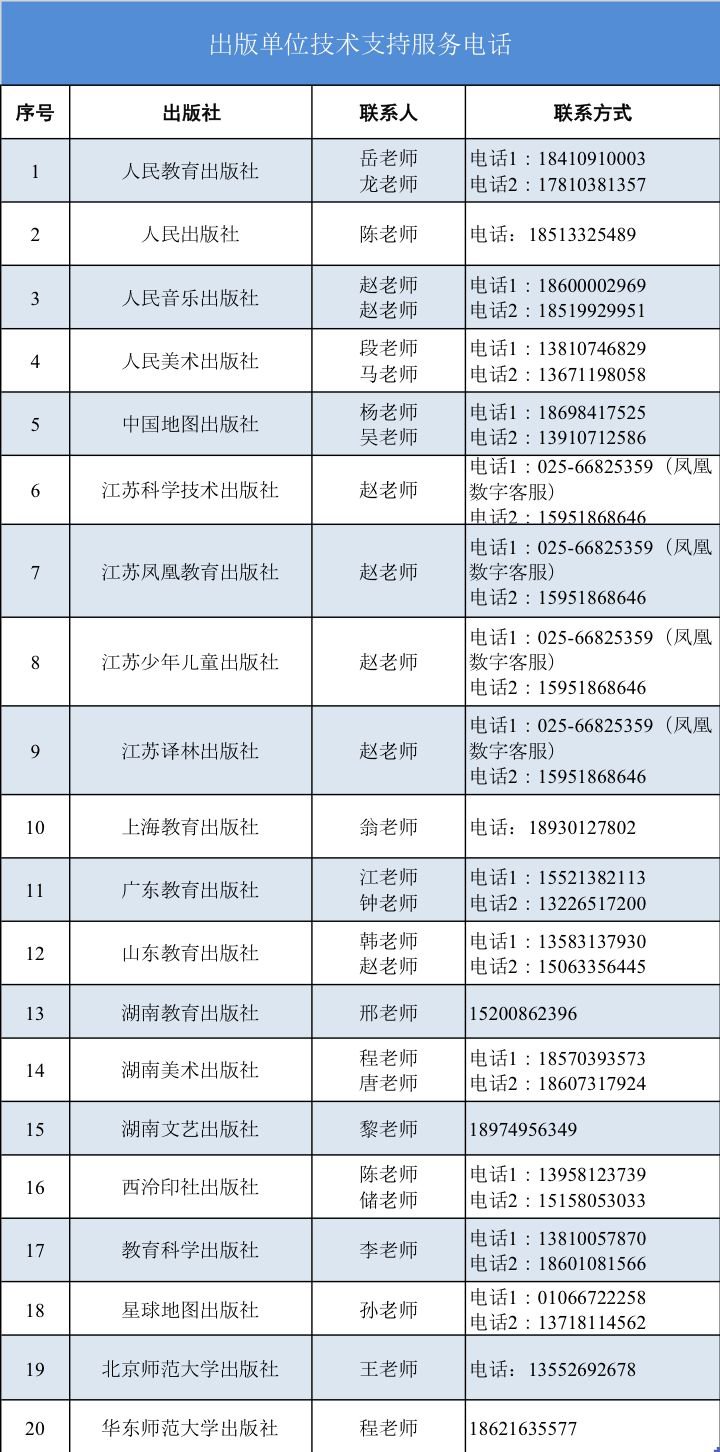 依据教育部《关于认真做好疫情防控期间教学用书供应工作的通知》和《关于发布中小学国家课程教材电子版链接的通告》要求,针对江苏省内中小学所使用的教材,江苏省决定公布各教材编写出版单位提供的免费电子版教材链接、教材出版单位技术支持服务电话。